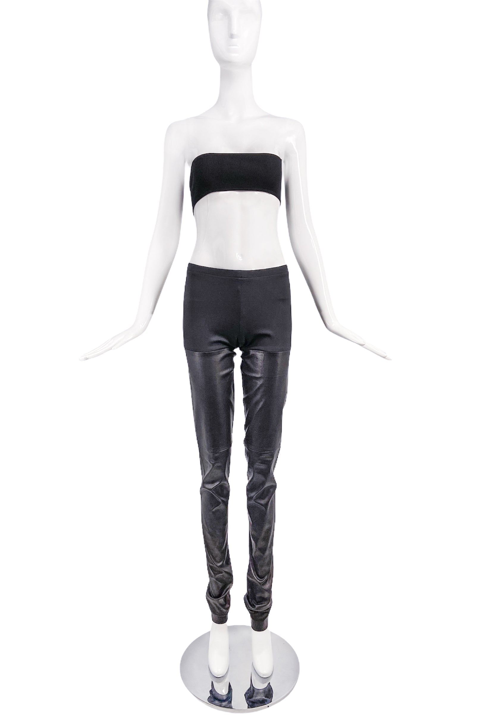 A pair of Ann Demeaulemeester black stretch nylon and black leather leggings. The leggings are cut quite long to create a very cool rippled and scrunched look to the leggings. Circa 2000s.