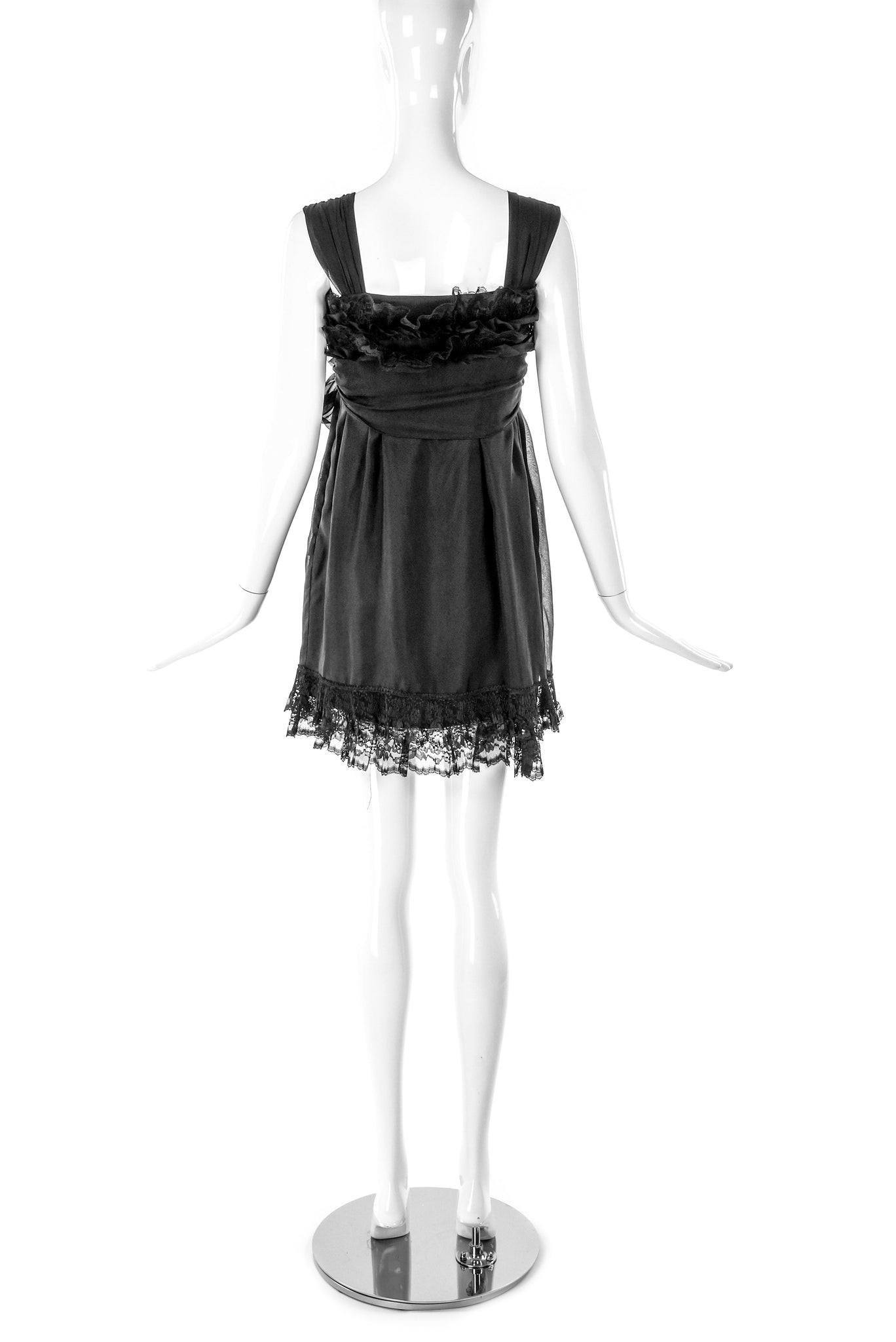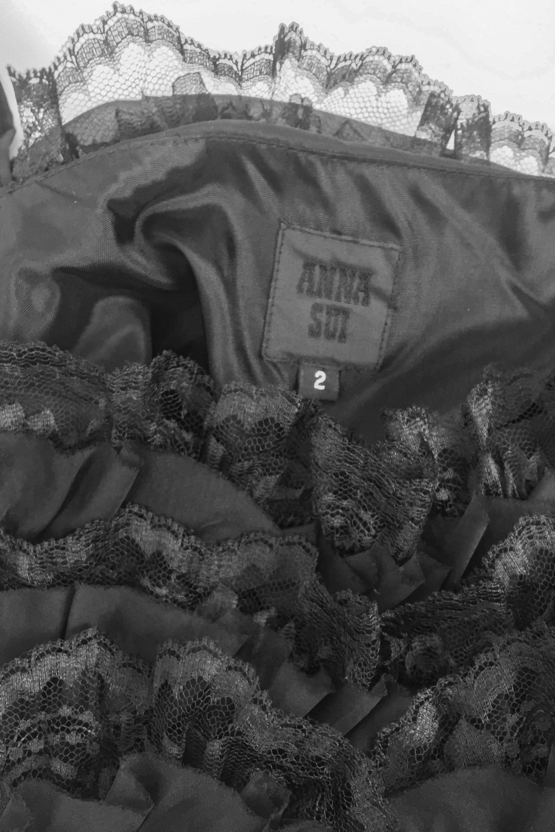 A redux of the classic Anna Sui baby doll dress in a black chiffon with chiffon ruffle details at the bust framed with black lace. The dress has a black lace trim around the bottom.