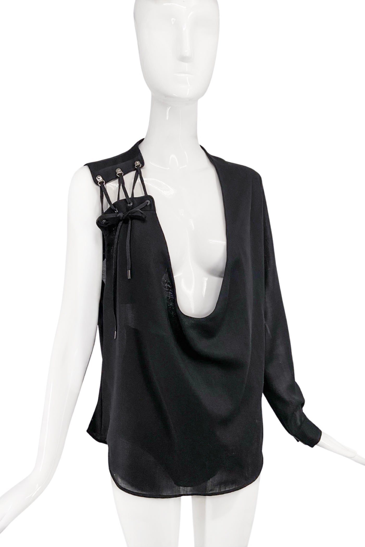 Anthony Vaccarello Black One Sleeve Lace Up Plunging Drape Top Fall 2016 Runway