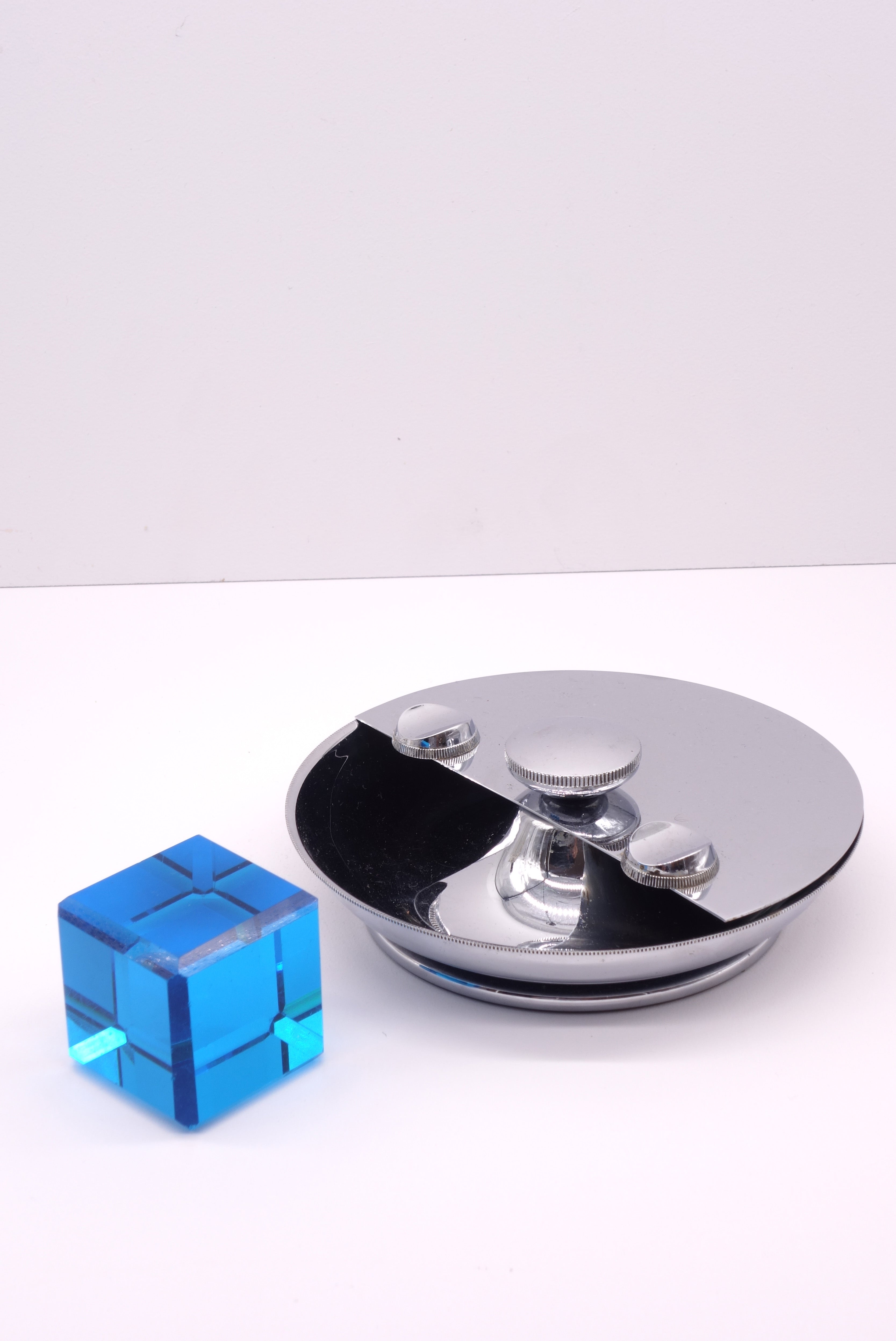 Super chic chrome vintage industrial modern design ashtray. The ashtray rotates and self cleans. Half covered, half open, turning knob in the middle, two cigarette resting pads on each side.