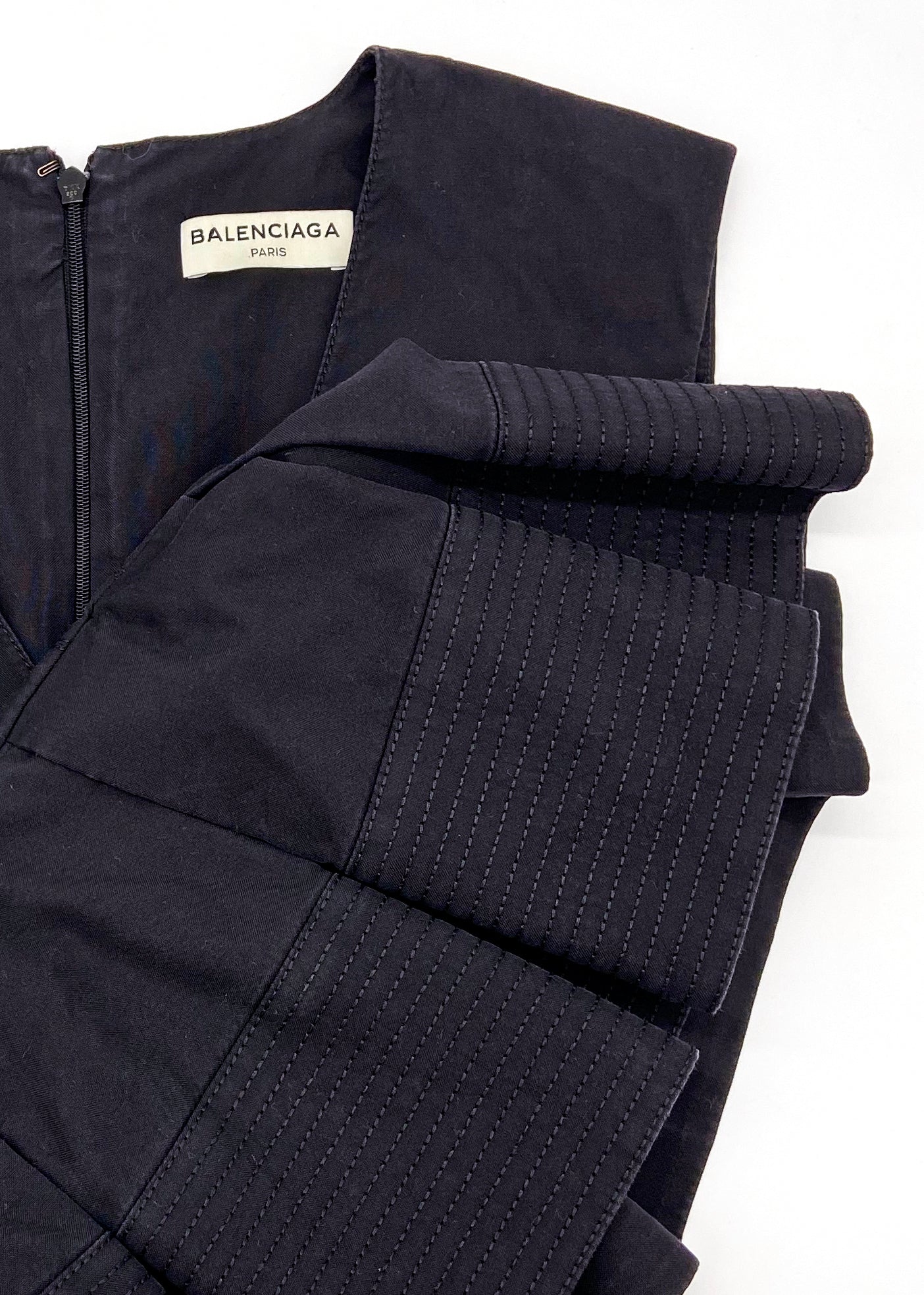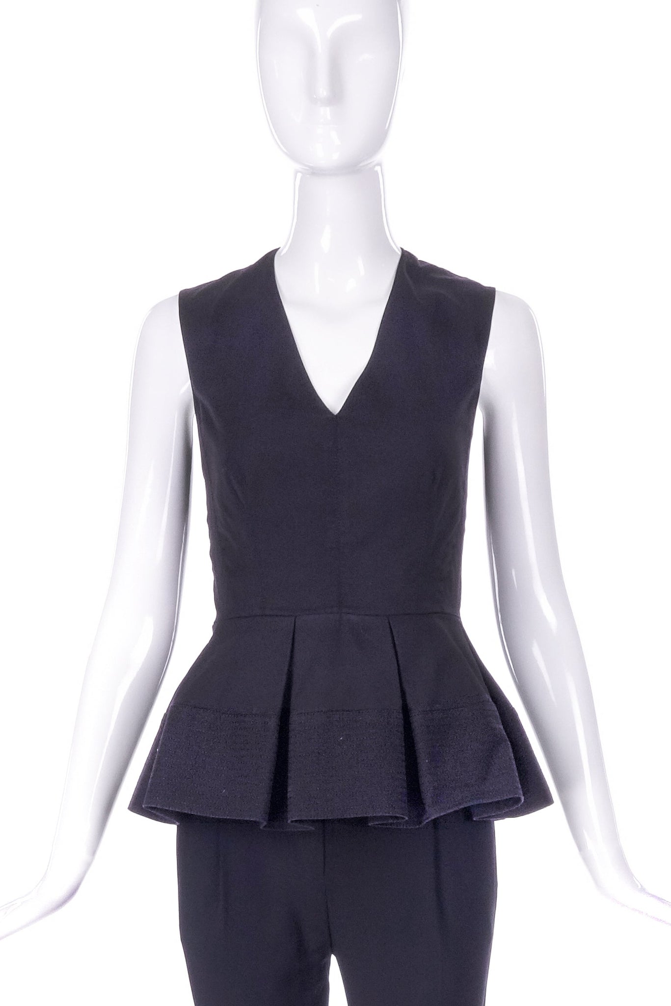 A Balenciaga Paris black cotton v-neck sleeveless top with a structured peplum detail. Parallel straight stitch details along bodice and running on the panel structured peplum creates a simple texture detail. Hidden zipper in back of the top which is 100% cotton. From the Balenciaga Paris by Alexander Wang Resort 2016 collection.