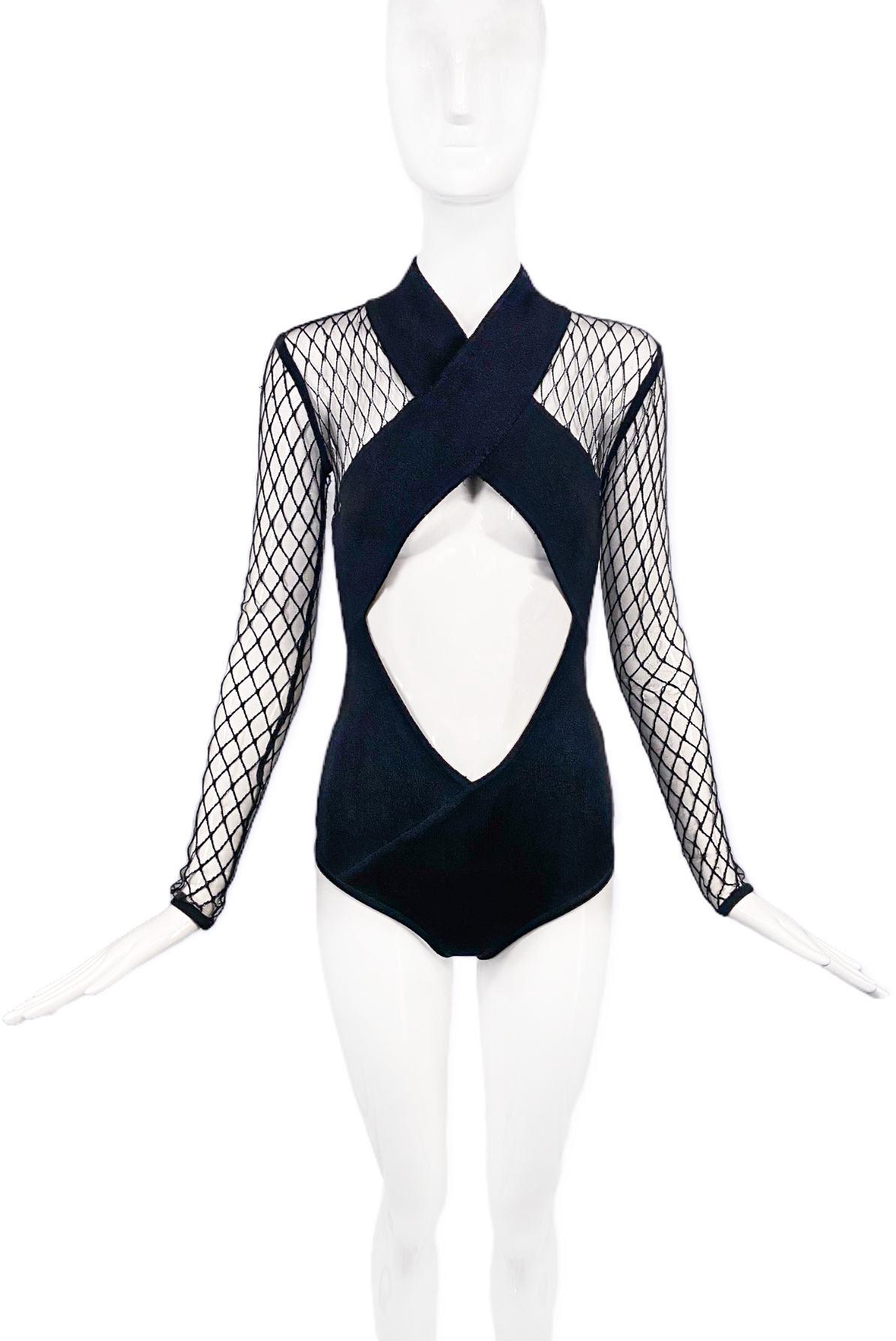 Balmain Black Cut-Out Bodysuit with Fishnet Tulle Sleeves SS2016