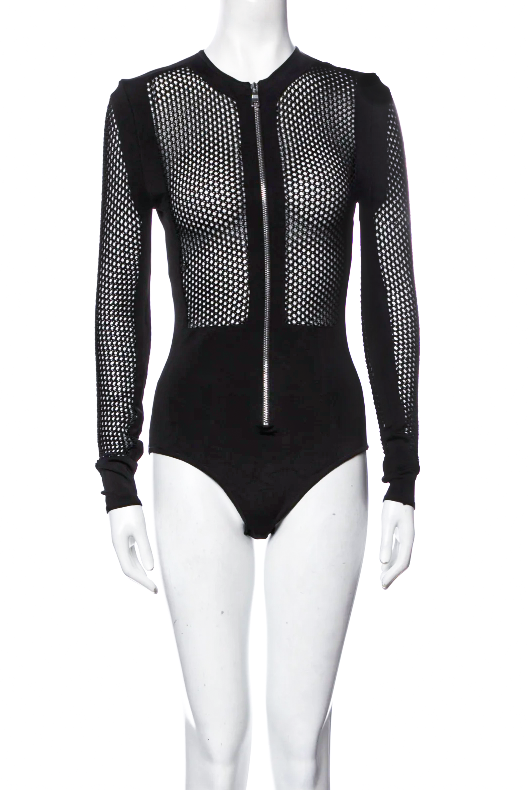 Balmain Black Fishnet Zipper Long Sleeve Body Suit #