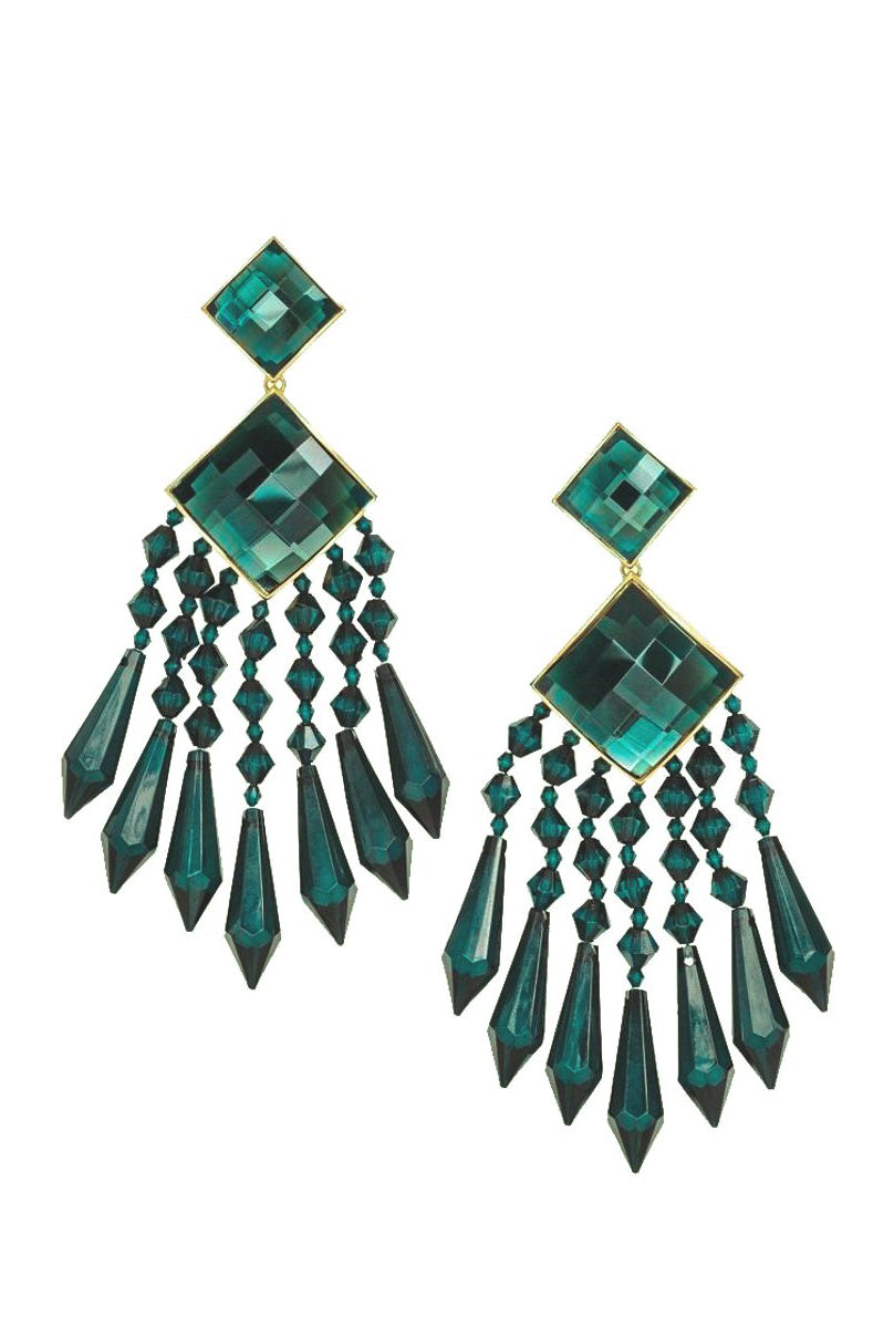 Balmain x H&M costume emerald chandelier earrings. From the 2015 Balmain collaboration with H&M, these earrings are a re-done version of the Balmain earrings that were shown in the Ready-to_Wear collection in Paris. These earrings have a clip on backing.