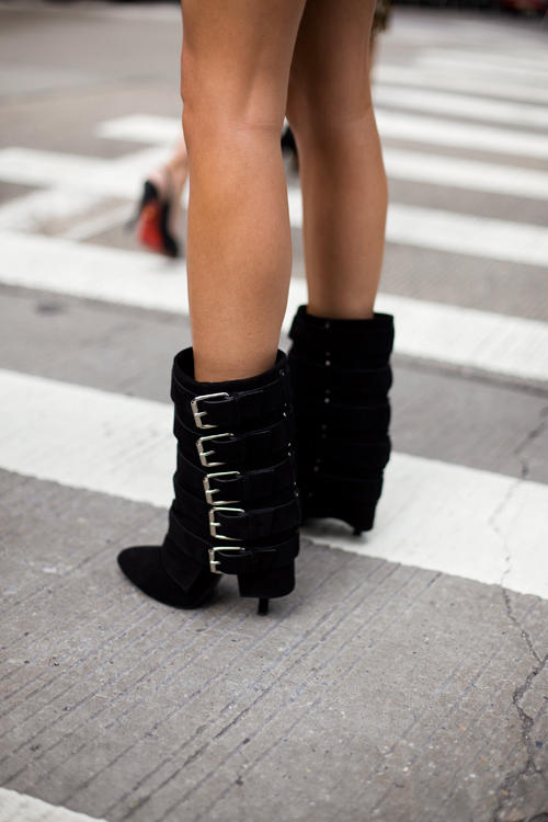 Balmain by Giuseppe Zanotti black suede heeled ankle boots with multiple straps going up the boot with square silver buckles. From the Balmain by Christopher Decarnin Fall / Winter 2009 ready-to-wear collection.