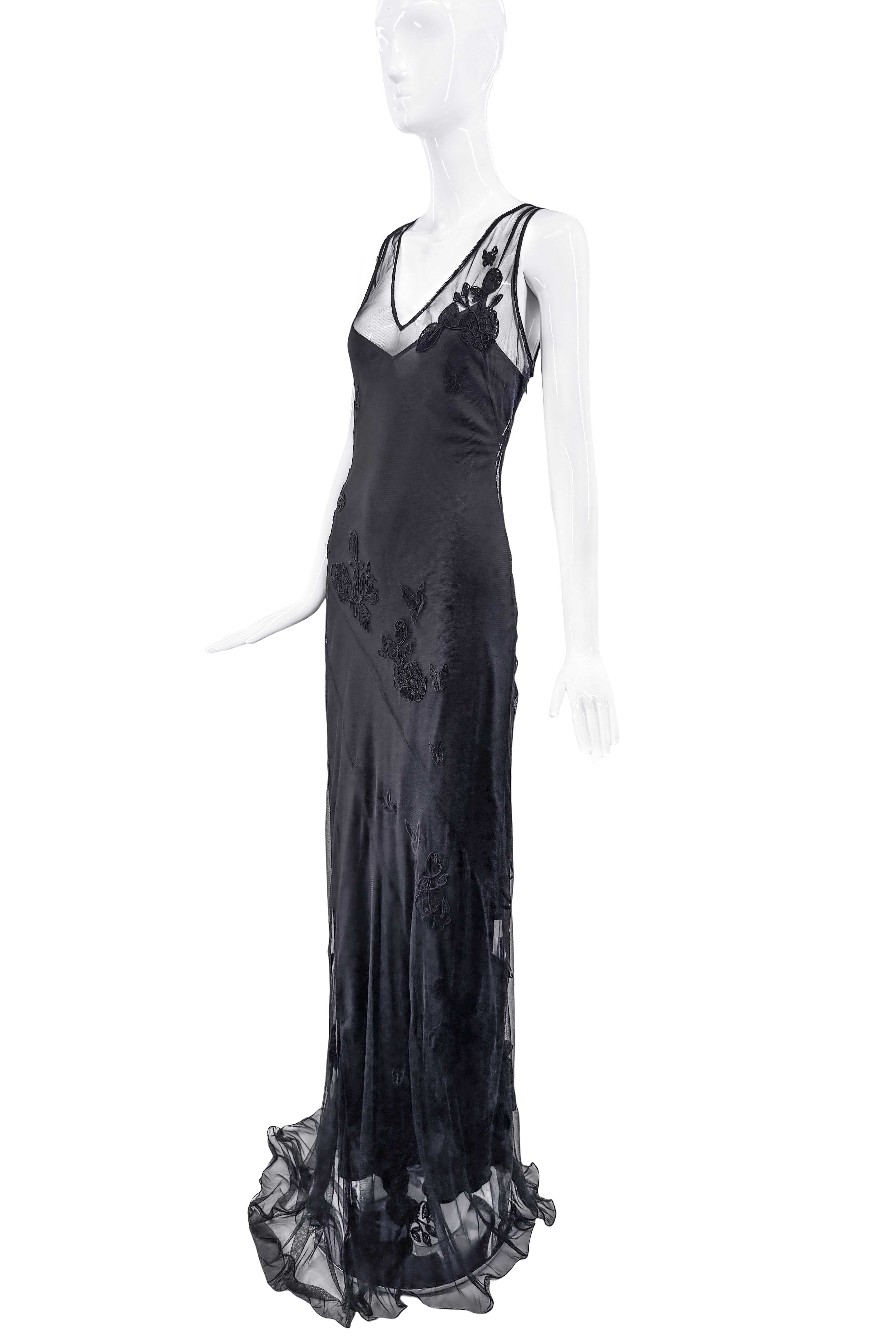 Blumarine Black Mesh Floral Applicate Slip Dress Gown