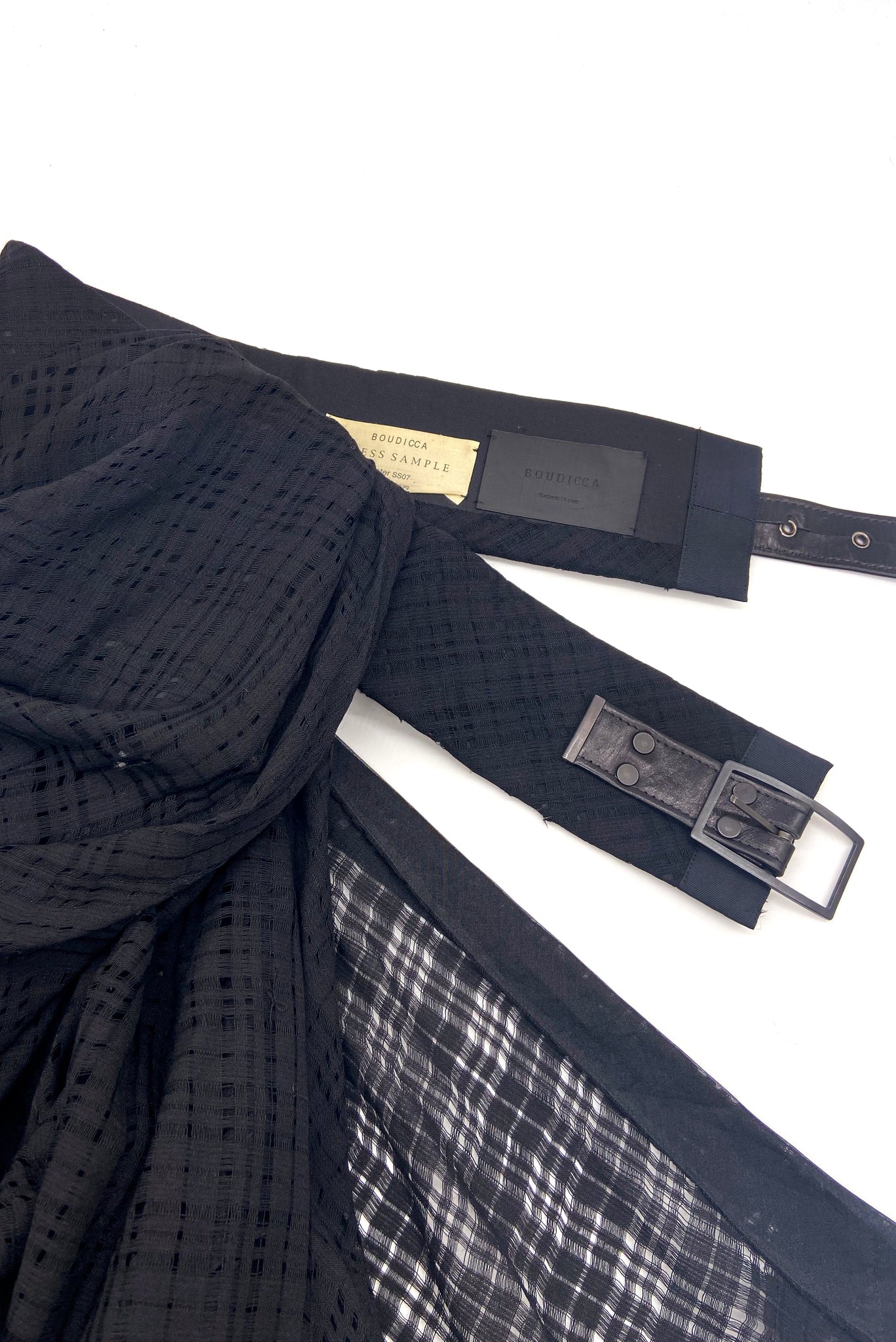 A Boudicca black slightly sheer tartan style knit pattern cascading asymmetrical "bustle" belt. The fabric covered belt has a gunmetal toned buckle with metal flat stud details. The fabric is gathered at the side of the belt to create a pleat-like bustle. From the Boudicca Spring / Summer 2007 collection.