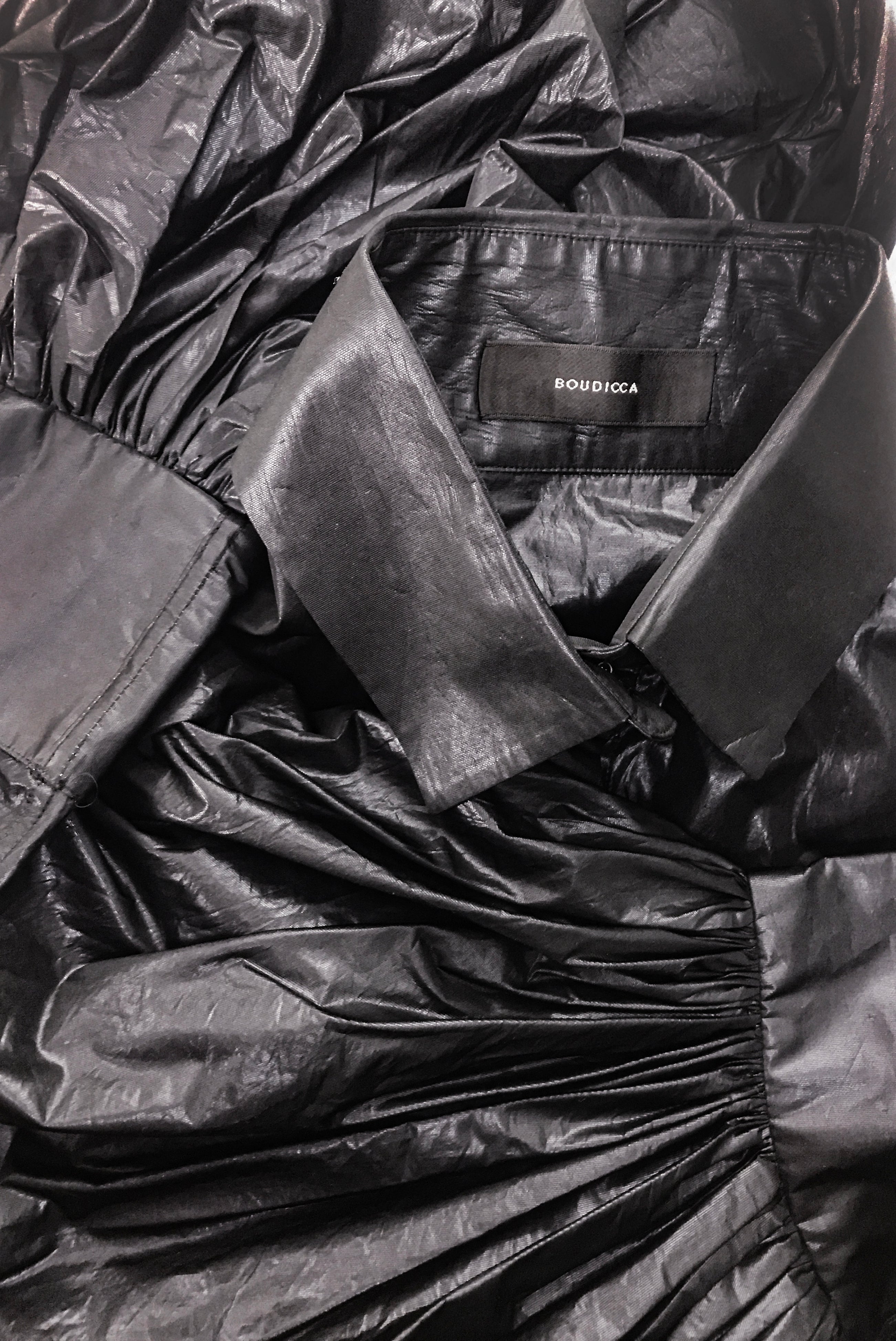 Boudicca black shiny silk nylon "Trashbag" blouse with exaggerated sculptural couture crafted balloon sleeves with a ruche pleated detail that allows for the sleeves to be molded into different shapes. From the Boudicca Fall / Winter 2005 runway collection Looks 11, 12 and 16.