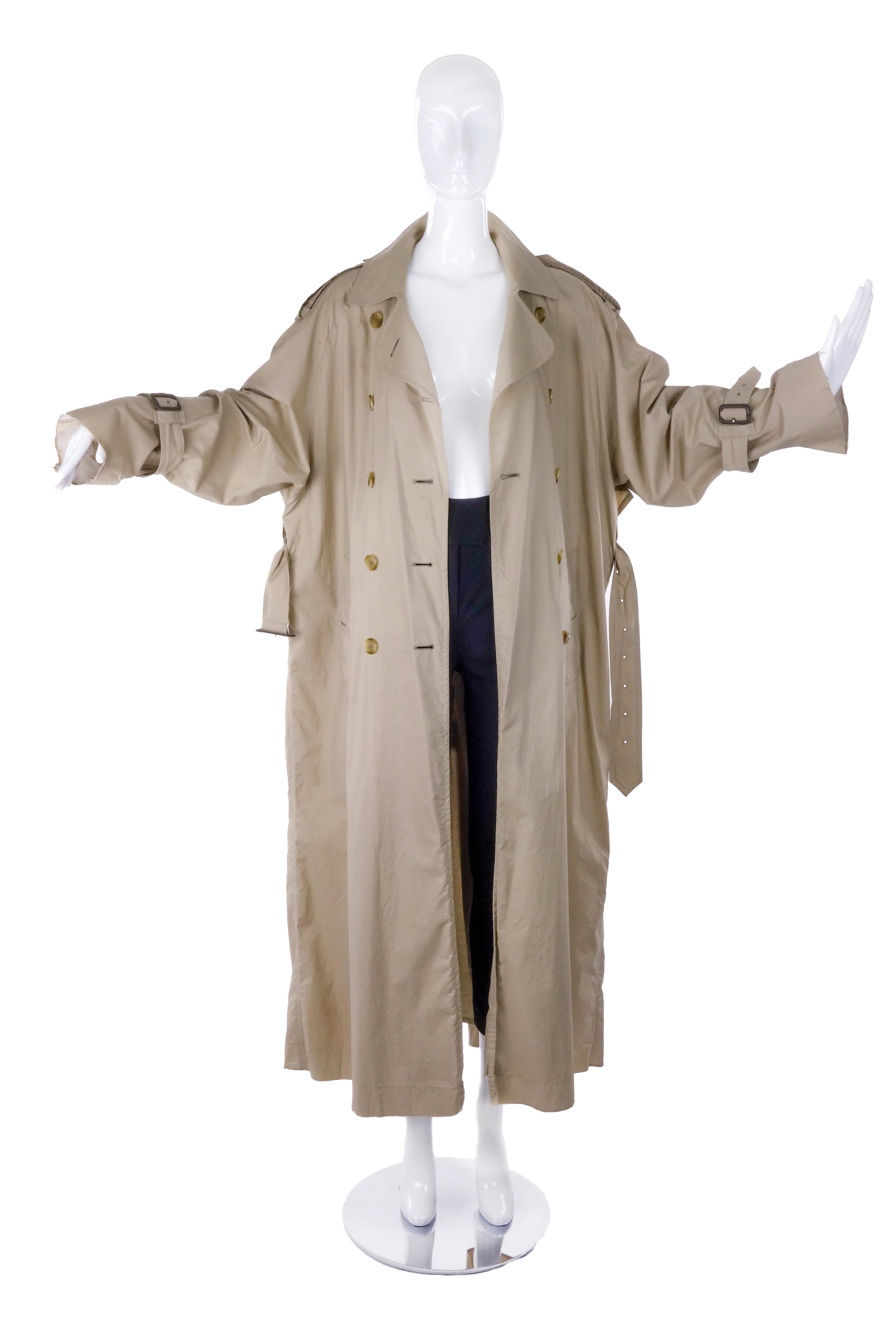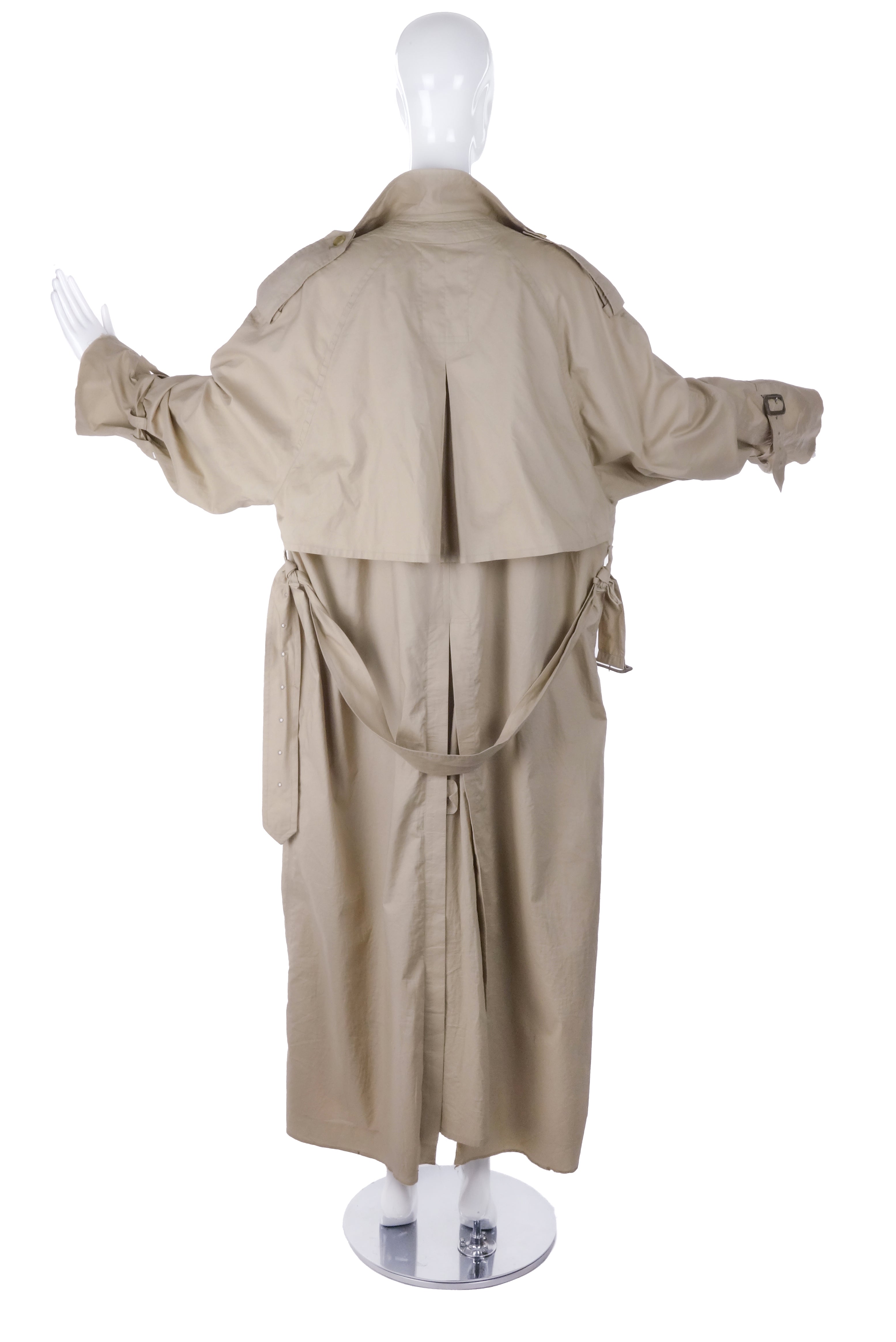 A vintage Burberry extremely oversized, ultra light fabric, classic double breasted trench coat with a belt and each sleeve cuff has strap details. The customized trench coat has raw edge details giving the classic trench a fresh take. The oversized style of the trench coat is very in the look of Vetemonts by Demna Gvasalia.