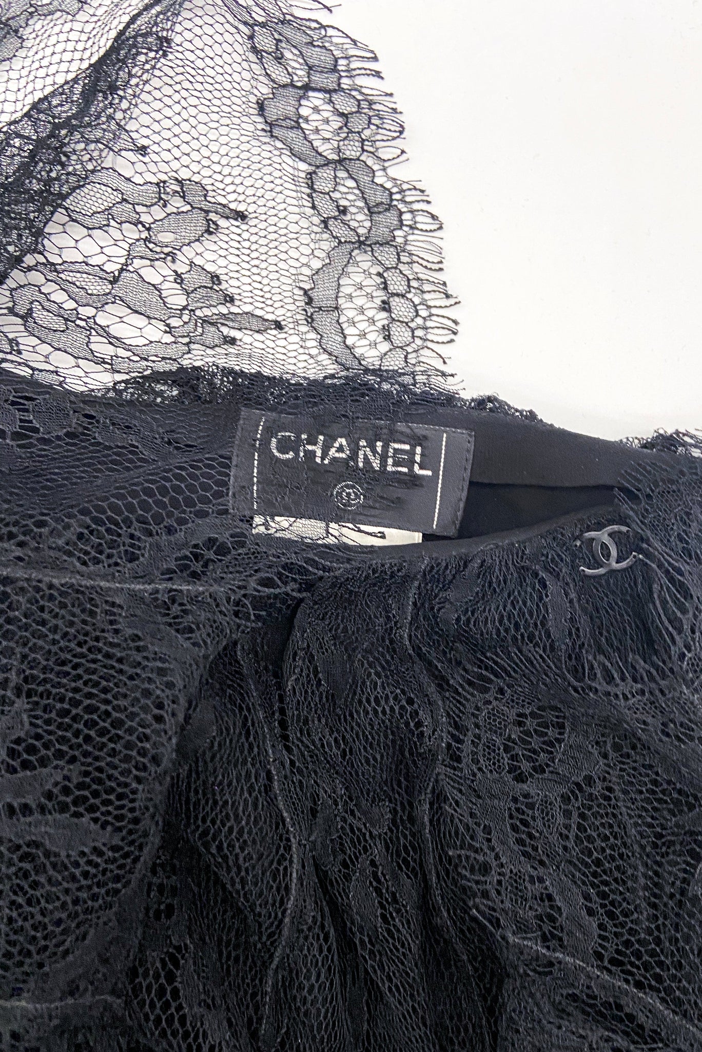 A Chanel black lace skirt with a floral pattern throughout the gorgeous lace. The lace is composed of to tiers to give the skirt a volume and flounce that highlights the handkerchief hemline of the skirt.