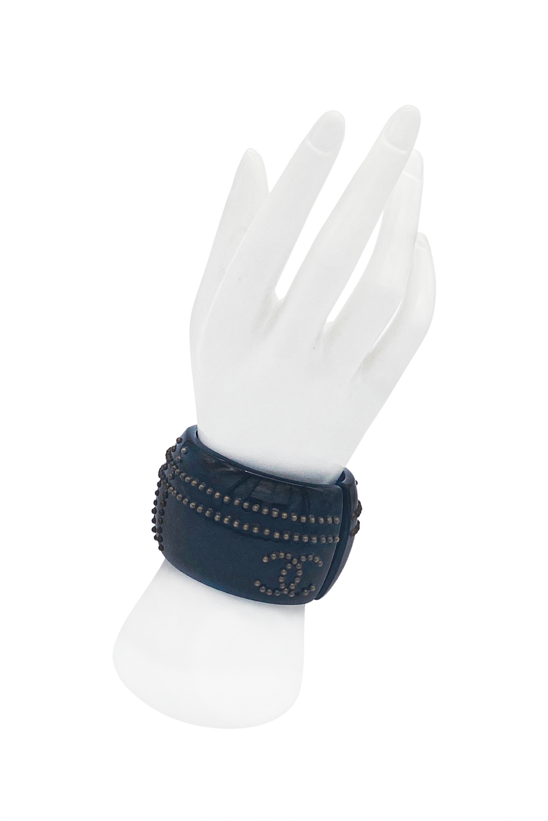A Chanel black resin large cuff with petit bronze rounded studs. The bracelet has the iconic Chanel CC insignia.