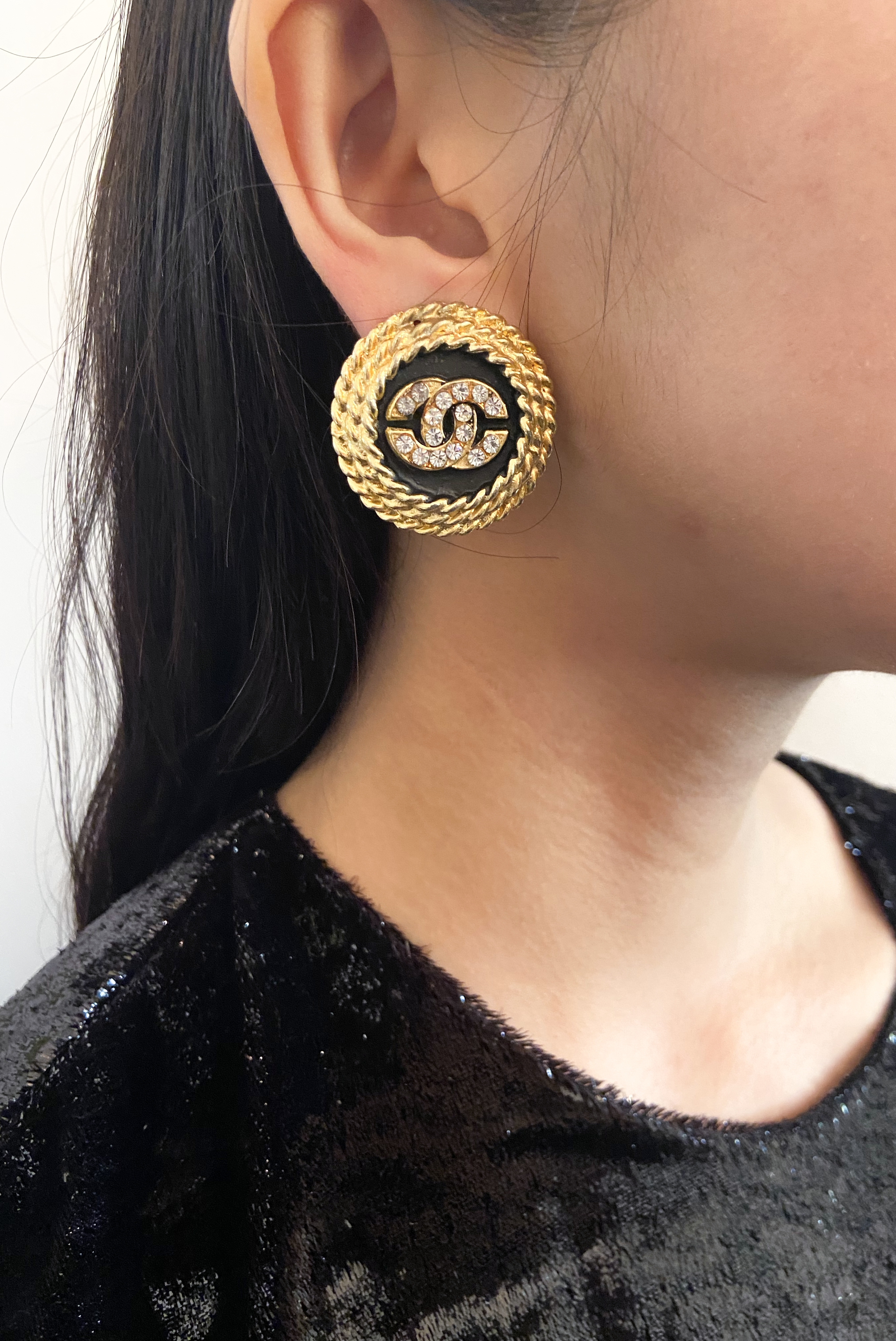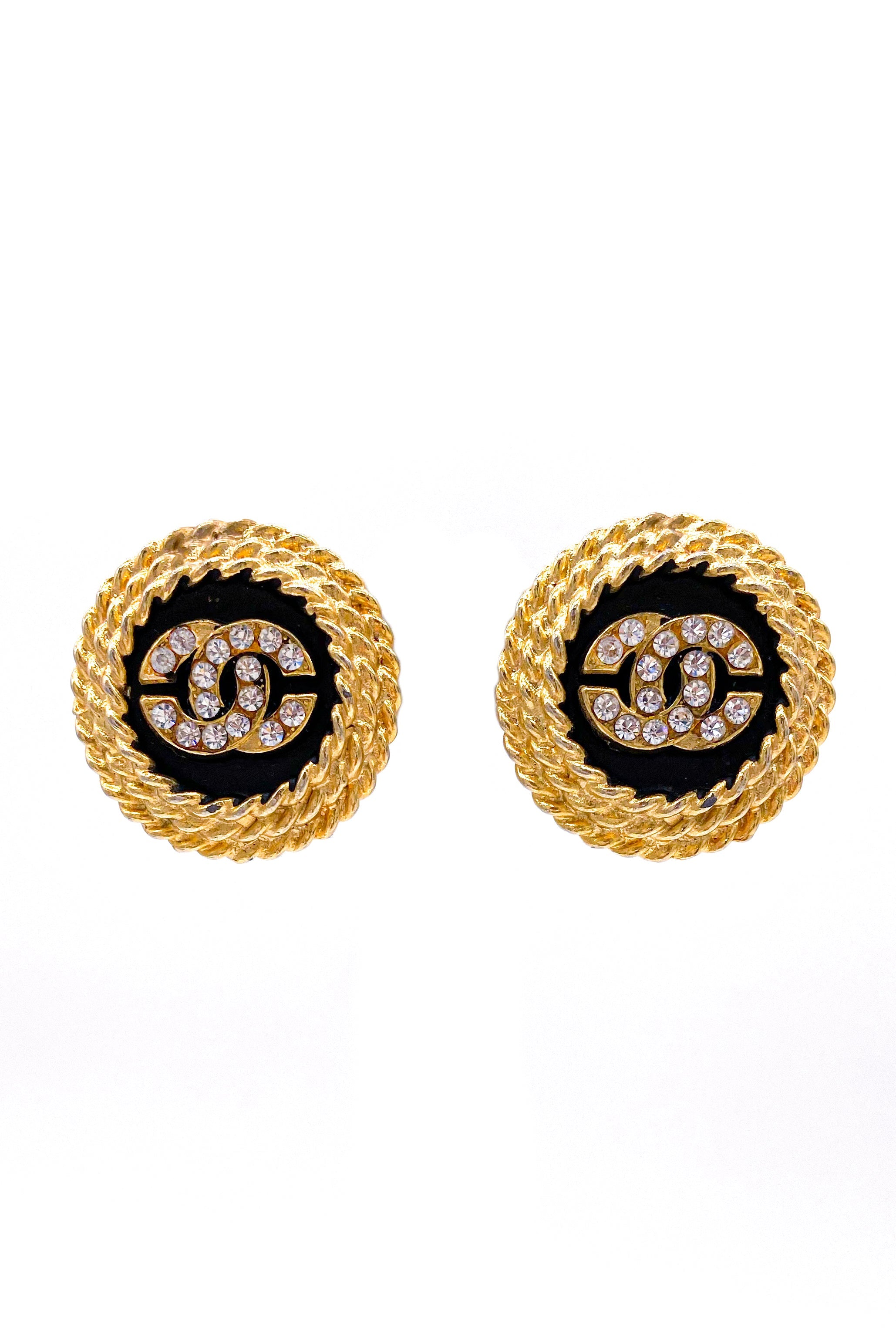 Chanel Button Black & Gold Basketweave & Rhinestone Logo Earrings