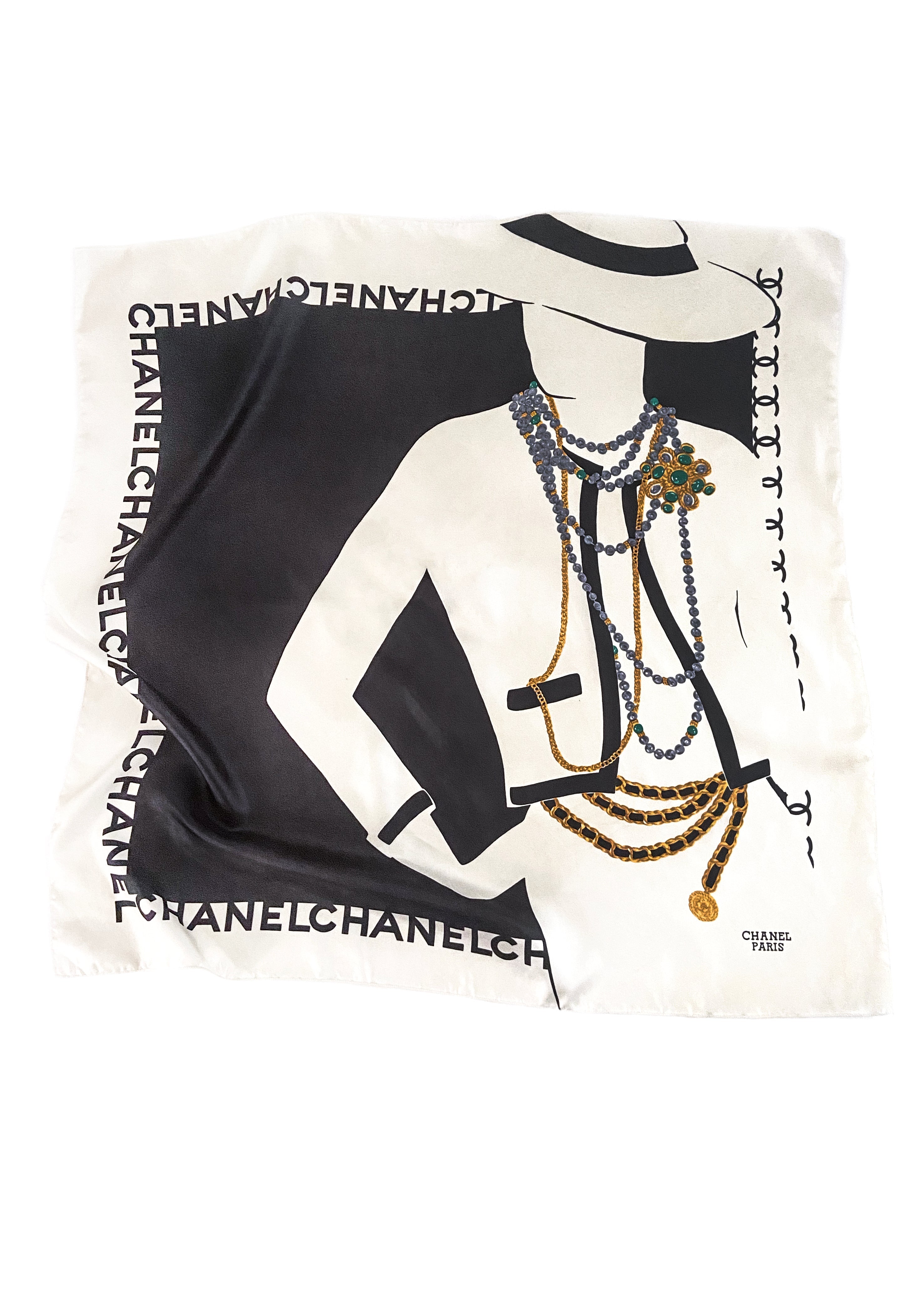 A set of Chanel silk scarves with a silhouette of "Mademoiselle Coco" wearing the iconic costume jewelry the House of Chanel is famous for creating with Gripoix in Paris. The scarves have hand-rolled edges and are 100% silk. Circa 1980's.