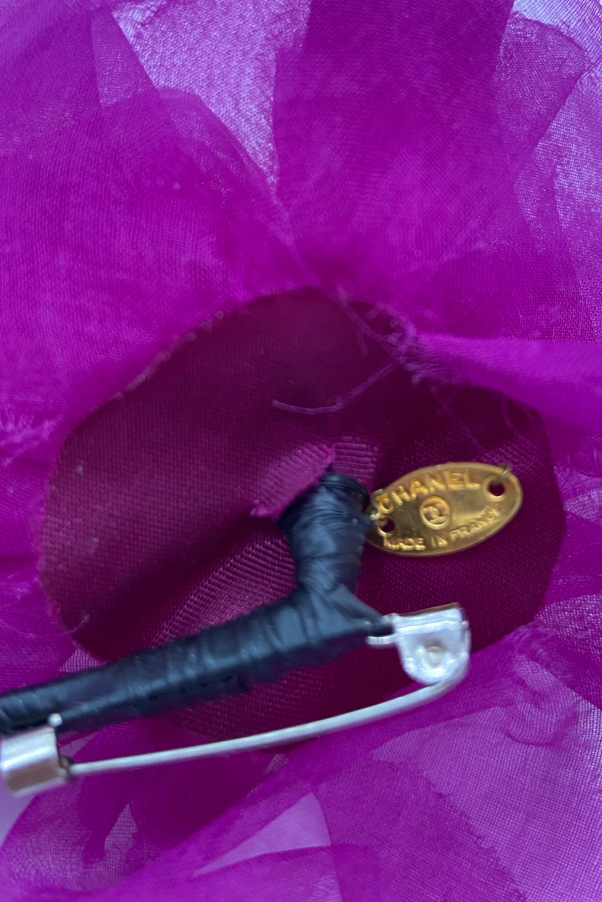 A Chanel classic camellia broach in a striking magenta color. The "petals" of the flower are created from a light, slightly sheer chiffon with a gold pin closed clasp. The Chanel broach has a gold oval "tag" stamped Chanel Paris.