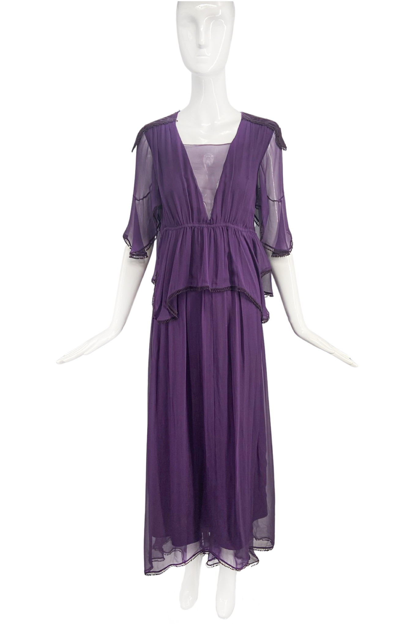Chloé Purple Chiffon Caftan Stevie Nicks Style Gown Dress with Suede Epaulets