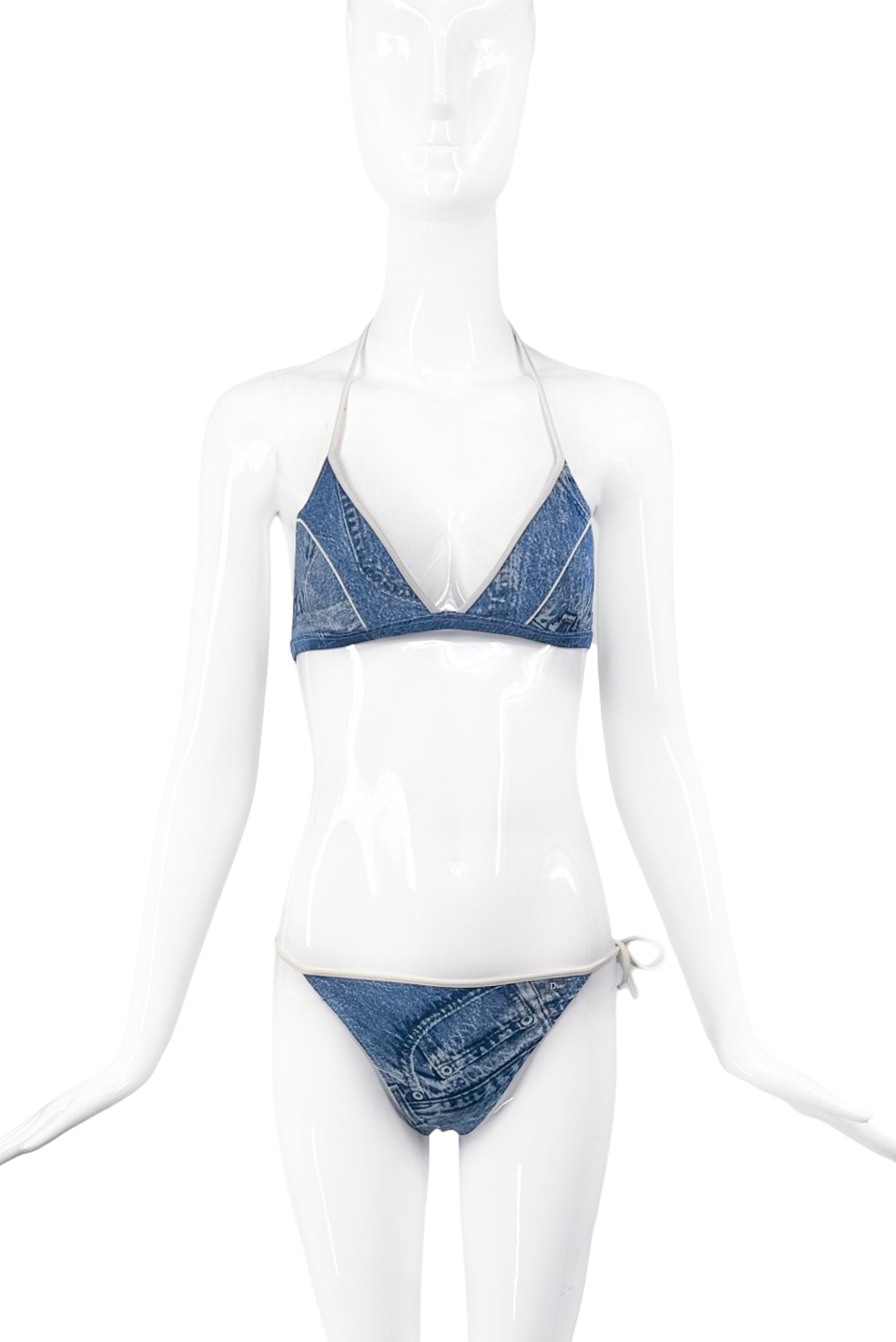 Christian Dior by John Galliano Blue Denim Print Logo One Piece Swim Bathing Bodysuit Spring 2000