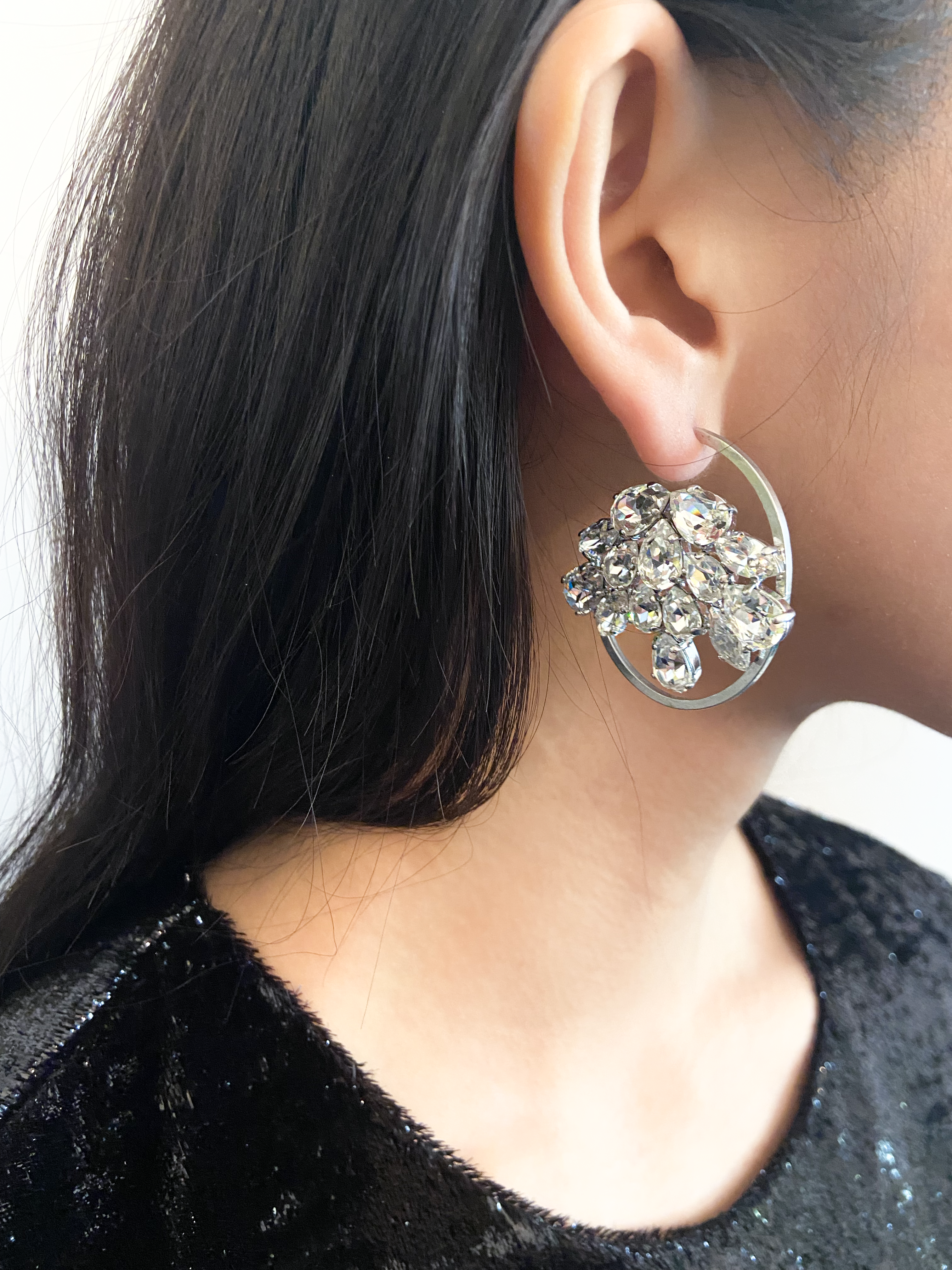 Dior by John Galliano Crystal Hoop earrings to be worn one forward one backward. Has a matching bracelet and ring.