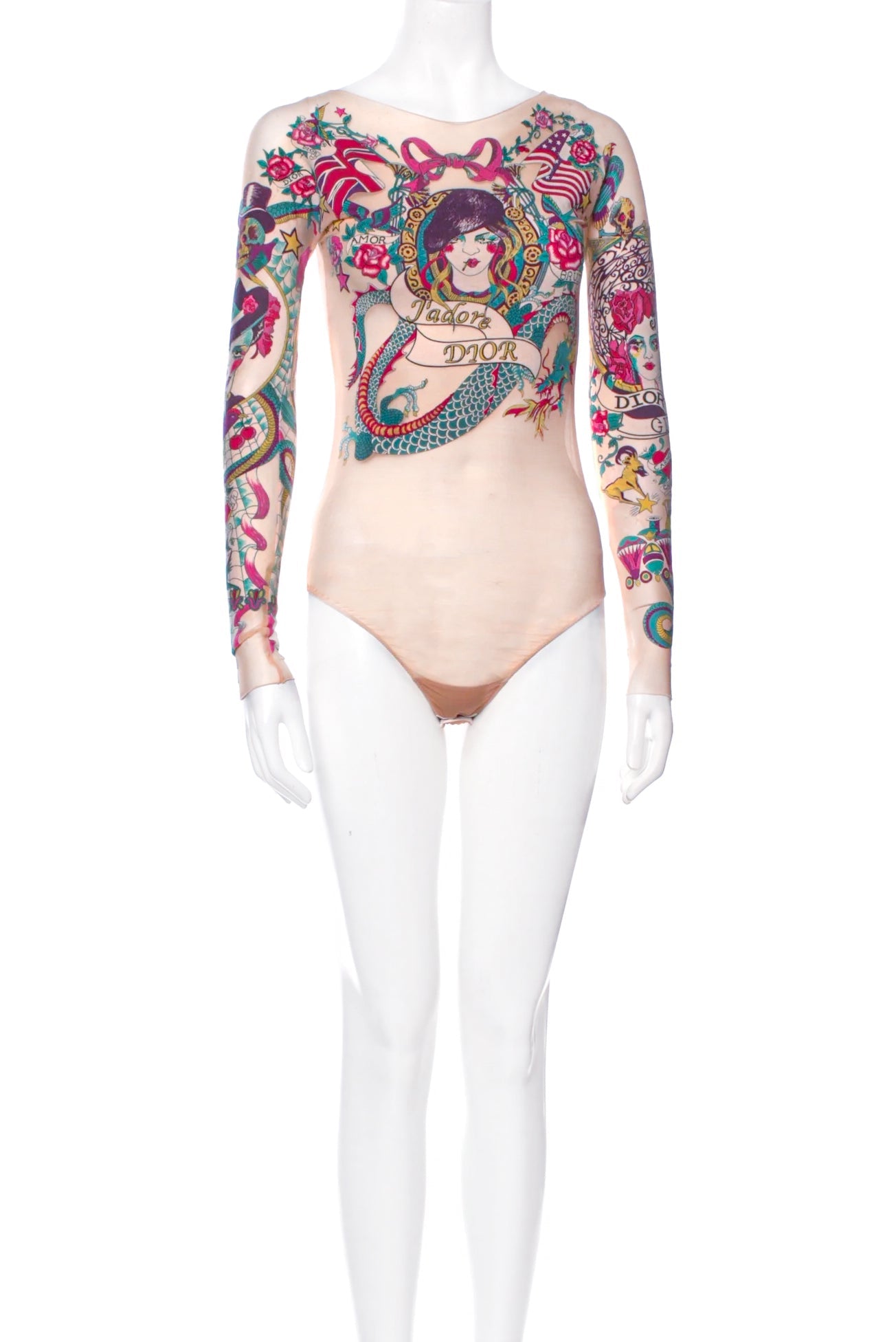 Christian Dior by John Galliano Nude Tattoo Print Logo Sailor Bodysuit Runway Spring 2004