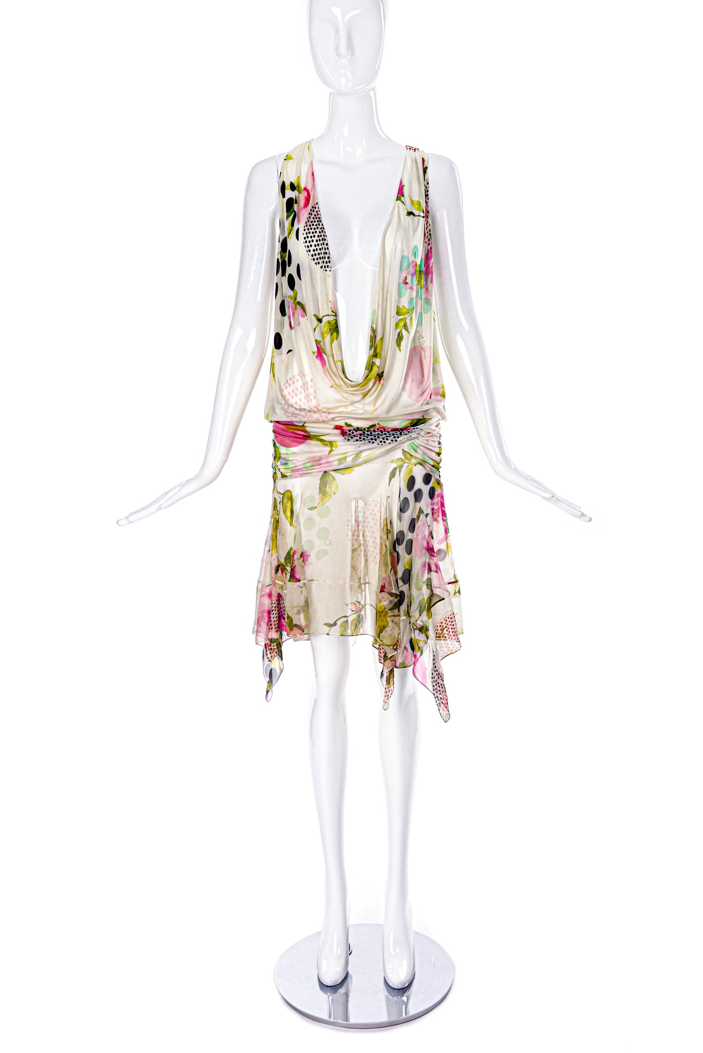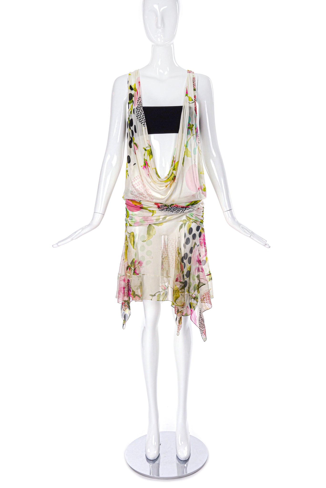 A Christian Dior by John Galliano  floral print chiffon slip dress from Look 30 in the Spring / Summer 2004 runway presentation. This chiffon dress has a deep drape in the front with a gorgeous wrap detail racer back.