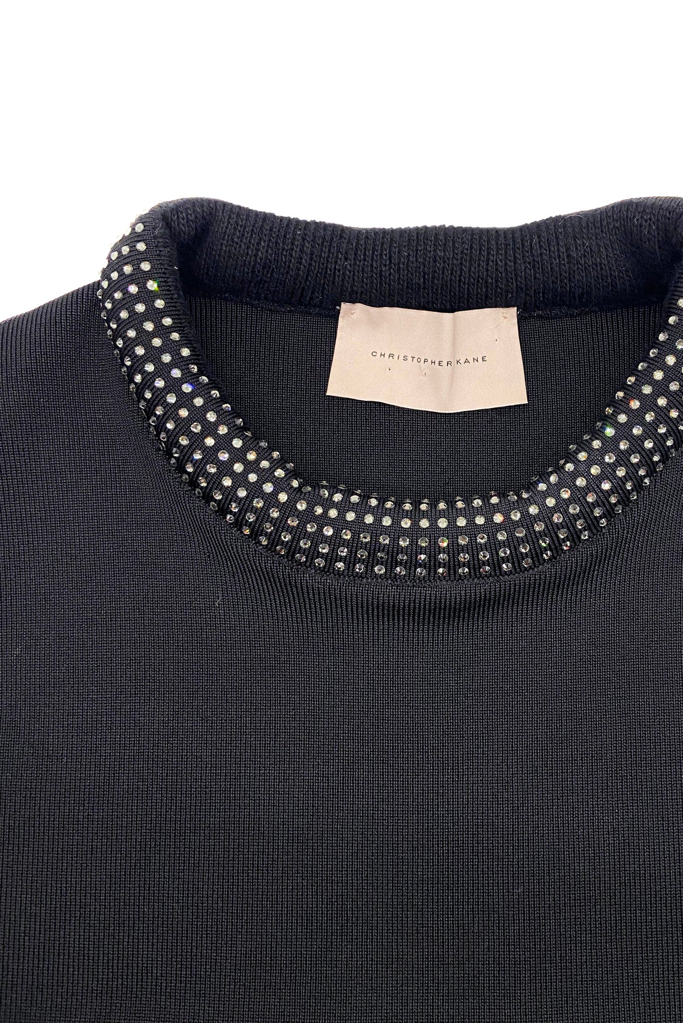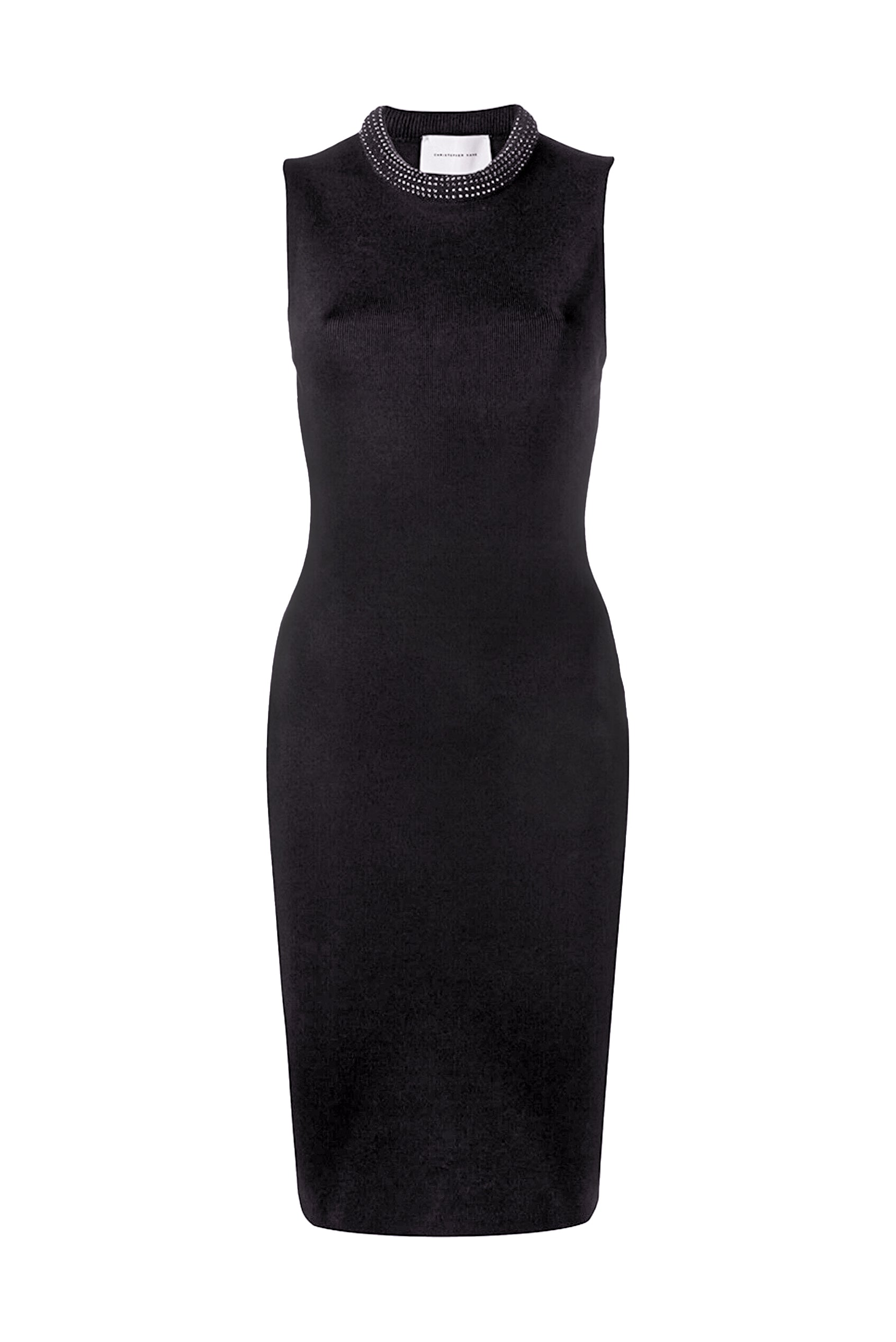 A Christopher Kane black viscose knit bodycon style sleeveless dress with a structured collar. The dress has a rounded, padded collar that is bedazzled with Swarovski crystals.