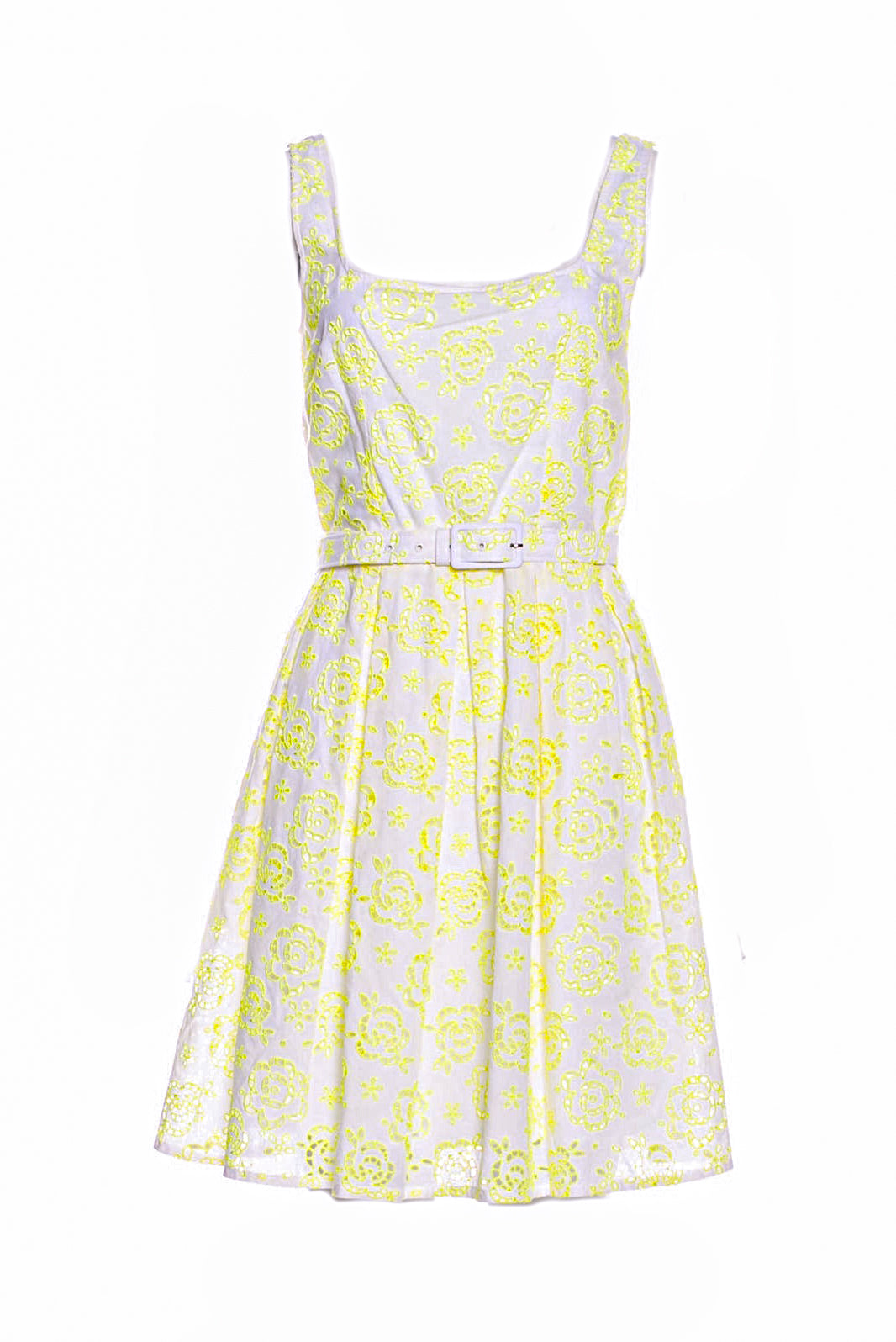 A Christopher Kane white and neon yellow eyelet lace fit and flare dress. The dress is composed of delicate eyelet lace with neon yellow highlights throughout the fabric to give the classic fabric a fresh feeling. The fit and flare dress has a matching fabric belt around the waist. There is an invisible zipper down the back with a hook and eye closure.