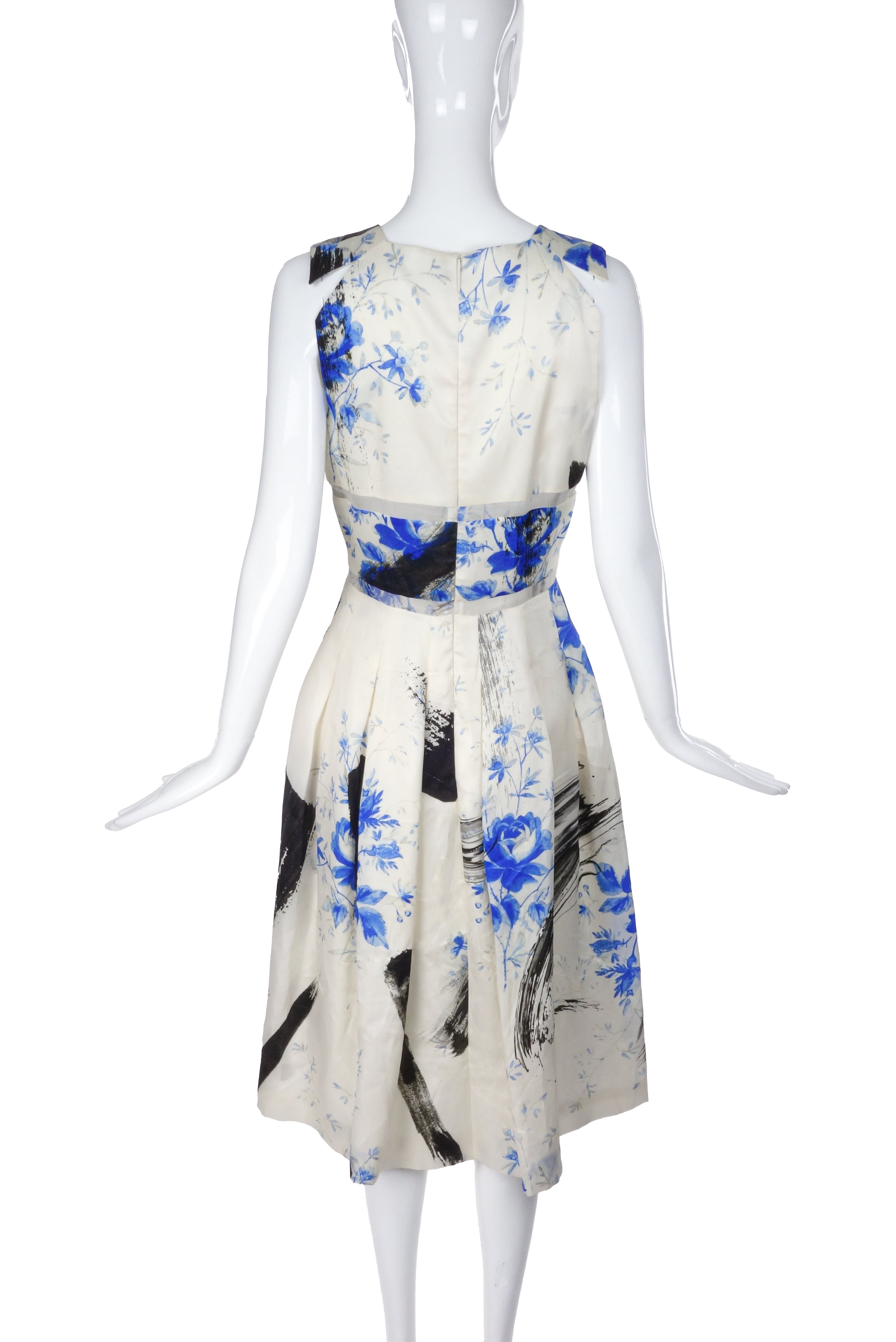 A Christopher Kane silk waterbrush "Dutch masters print" fit and flare princess dress. The elegant dress has a black and azure blue print throughout the silk fabric with sheer chiffon inserts along the waist and underneath the bust. The dress has geometric origami style shoulders with an invisible zipper down the back of the dress. From the Christopher Kane Resort 2013 Collection Look 32.