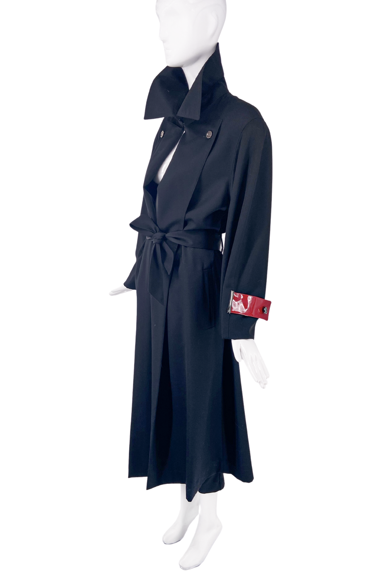 Claude Montana Black Broad Shoulder Trench Coat with Red Patent Leather Straps