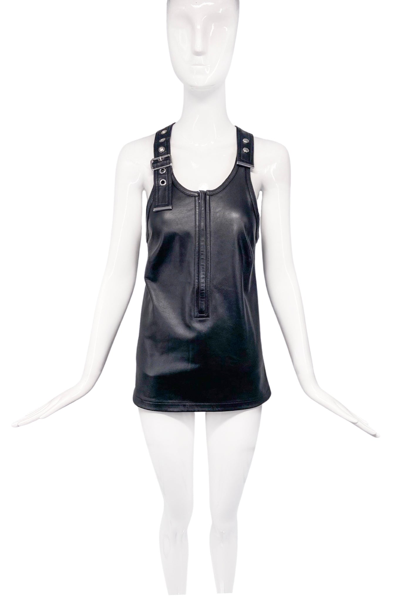 Diesel Black Gold Black Leather Asymmetric Strap Metal Hardware Top Short Dress