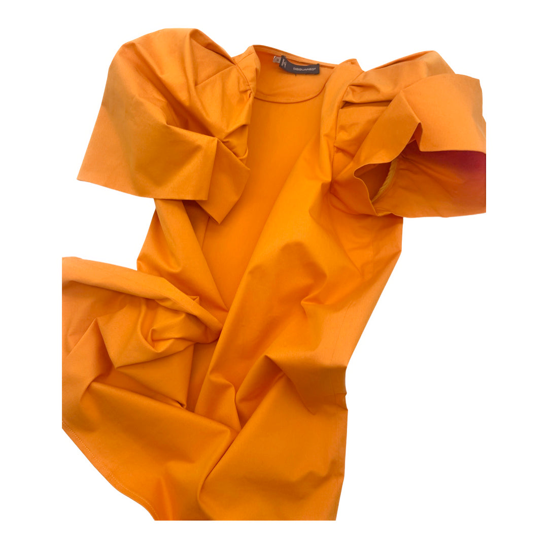 A Dsquared2 orange cotton blend t-short with exaggerated pouf sleeves. The sleeves are given structure by an intricate pleat detailing and give the strong shoulder line an elegant touch. From Dsquared2 Spring / Summer 2017.
