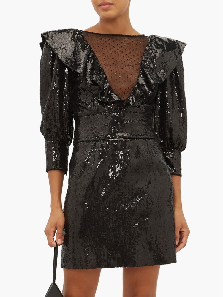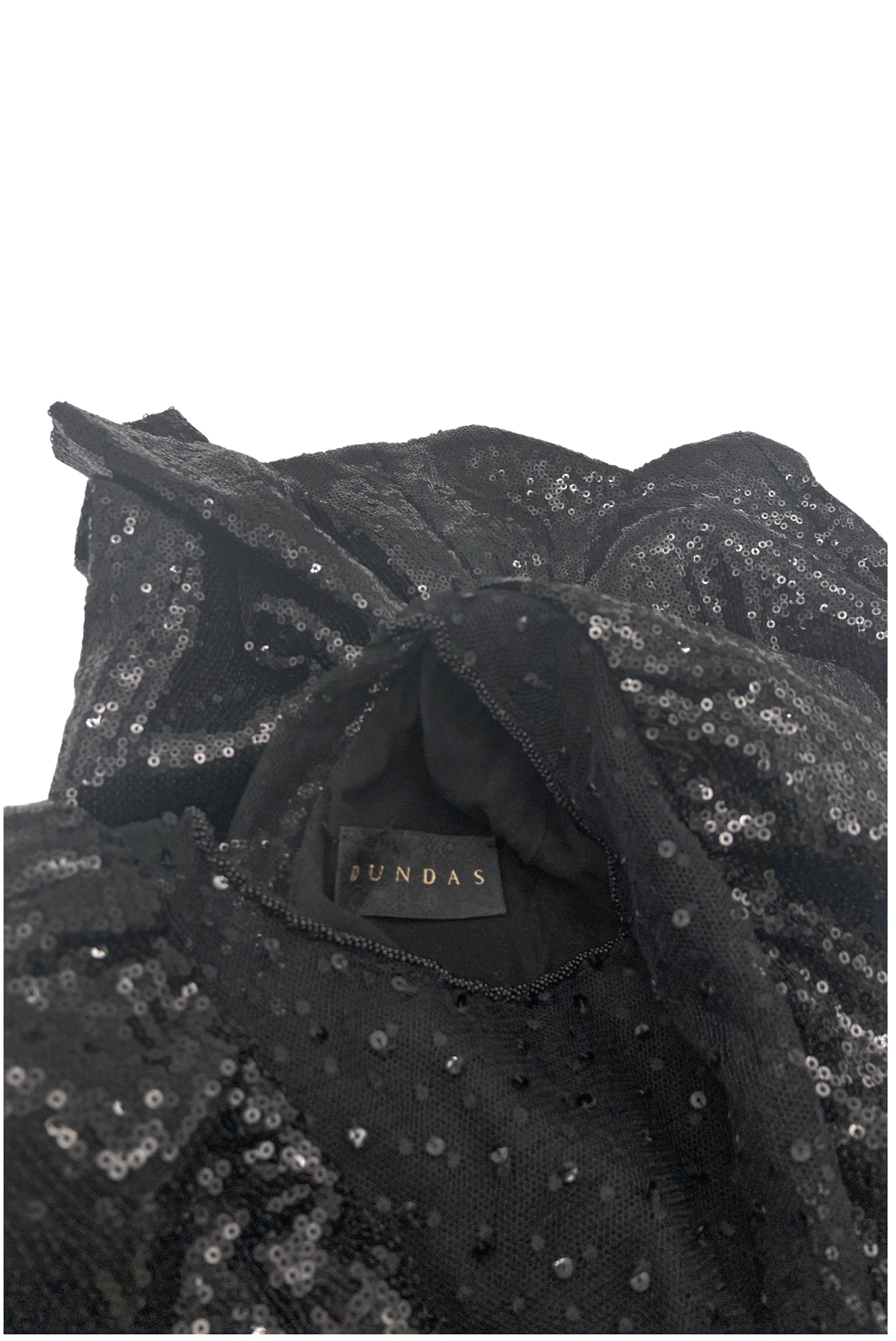 Dundas By Peter Dundas Black Sequin Bateau Ruffle Shoulder Sheer V Neck Net Mesh Dress