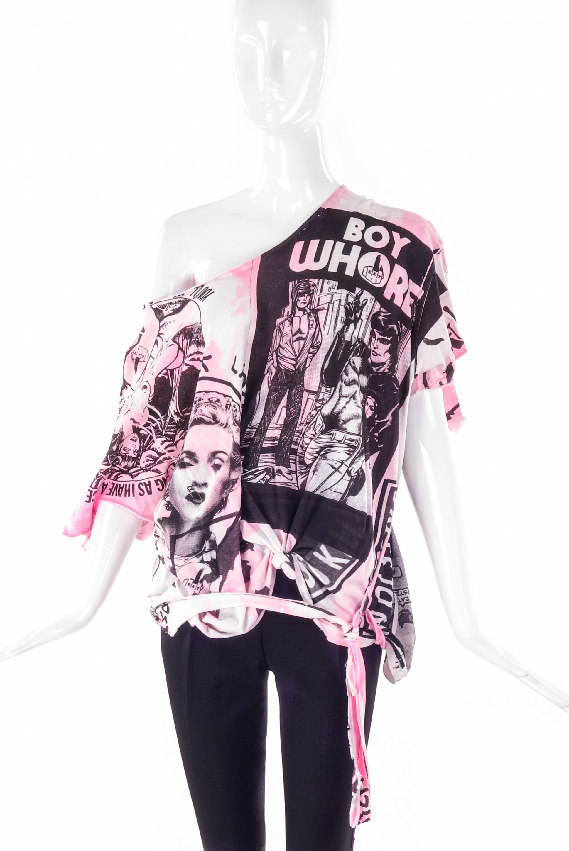 The T-shirt has various motif's and slogan's including "Boy Whore", "Queen Madonna with Safety Pin through her mouth", "As Long as you have a face, I have a place to sit", "Snowwhite's fairy tale - Anal or Oral", "Eat Lipstick Middle Finger".