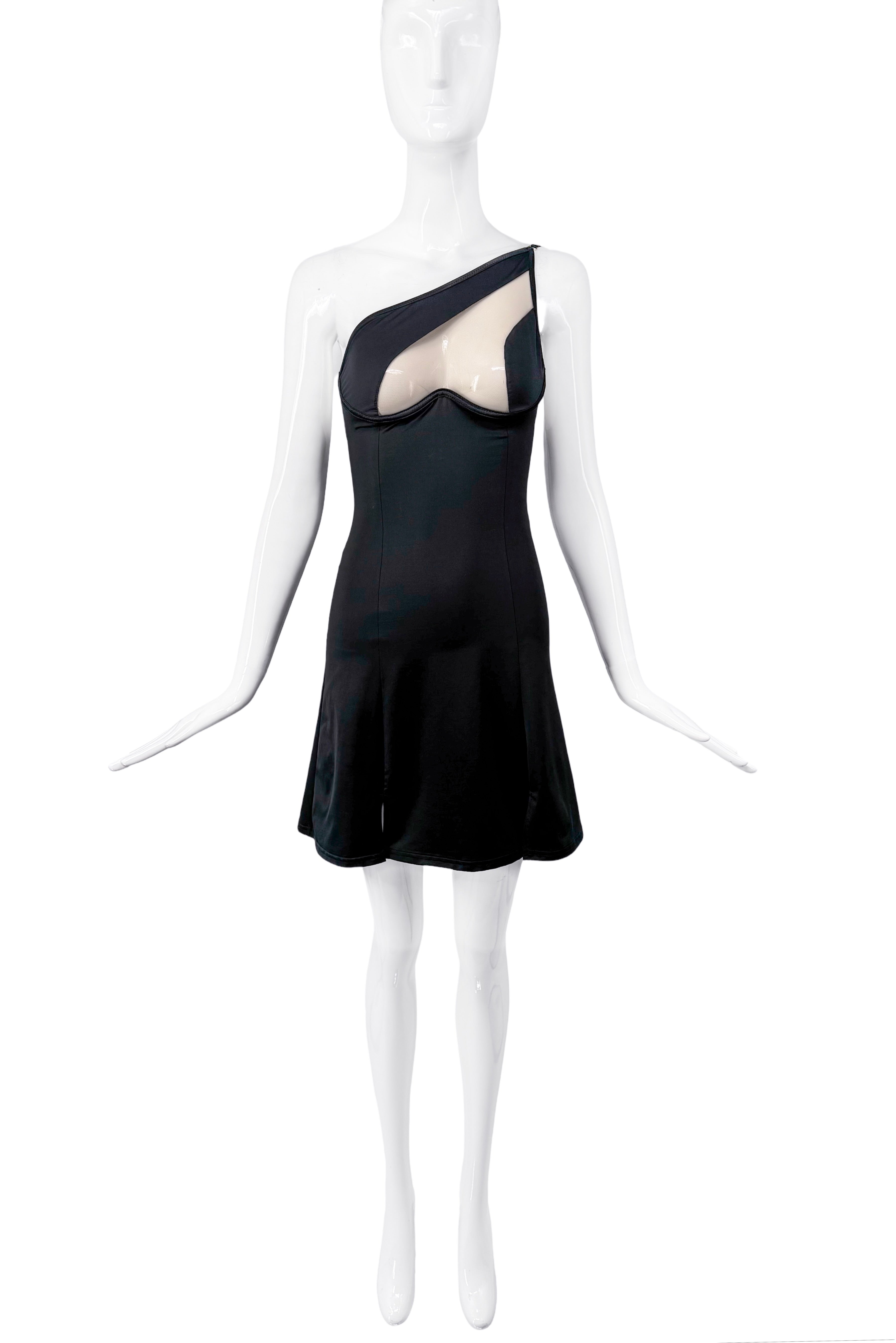 God Save Queens Mugler Style Black Stretch Cut Out Netting One Shoulder Dress