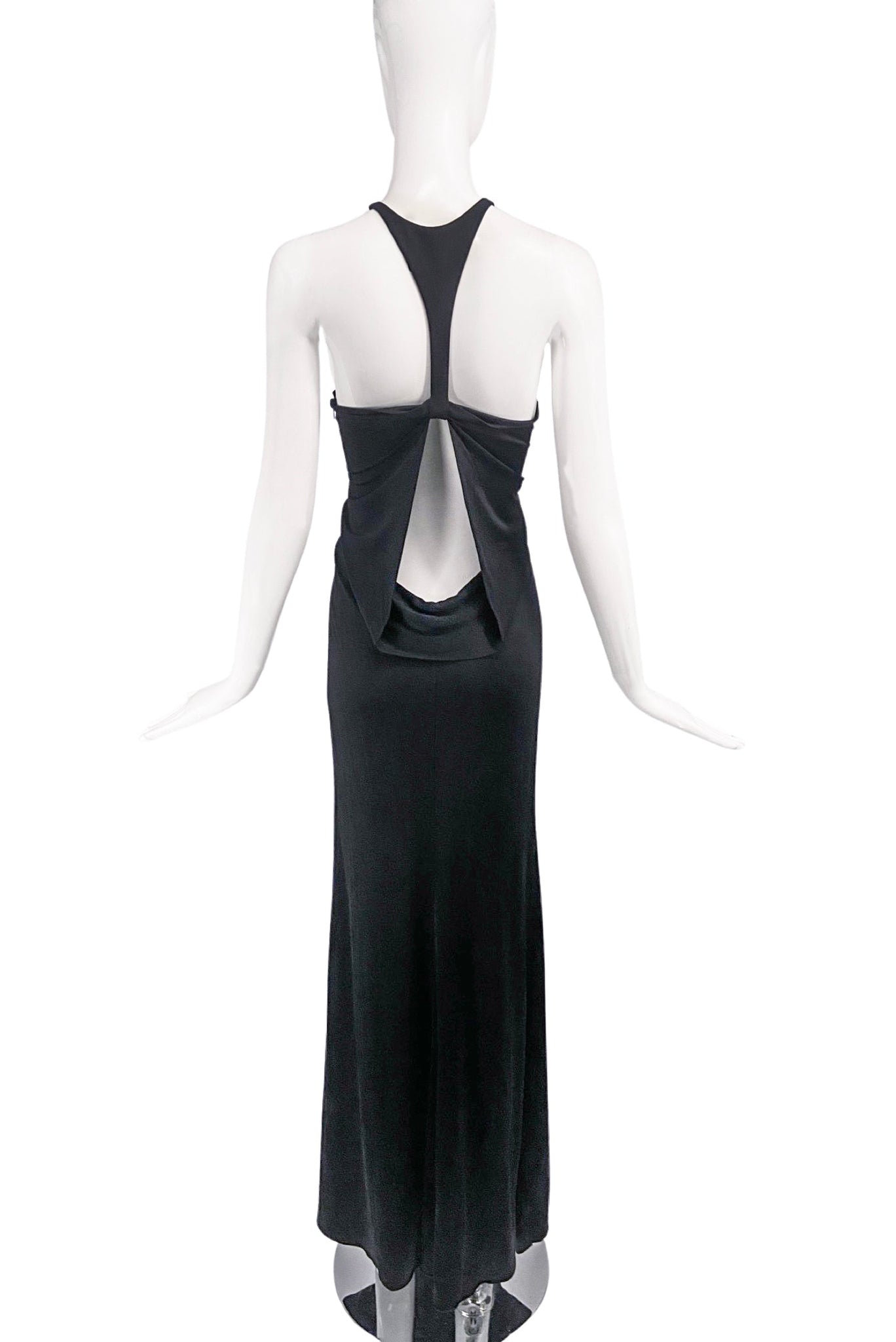 A Gucci black rayon and silk jersey gown with cut-outs on the front and knotted detail at the bust to create a pleated detail bust attached to a delicate harness collar. The back of the gown has a sexy but elegantly constructed draped back detail. From the Gucci by Tom Ford Fall