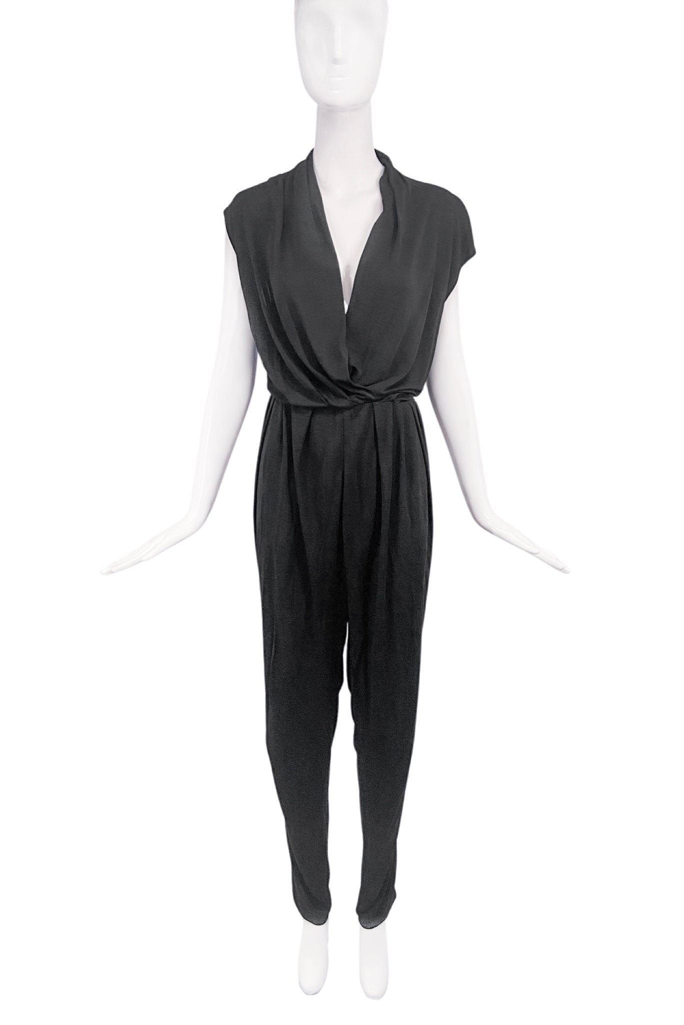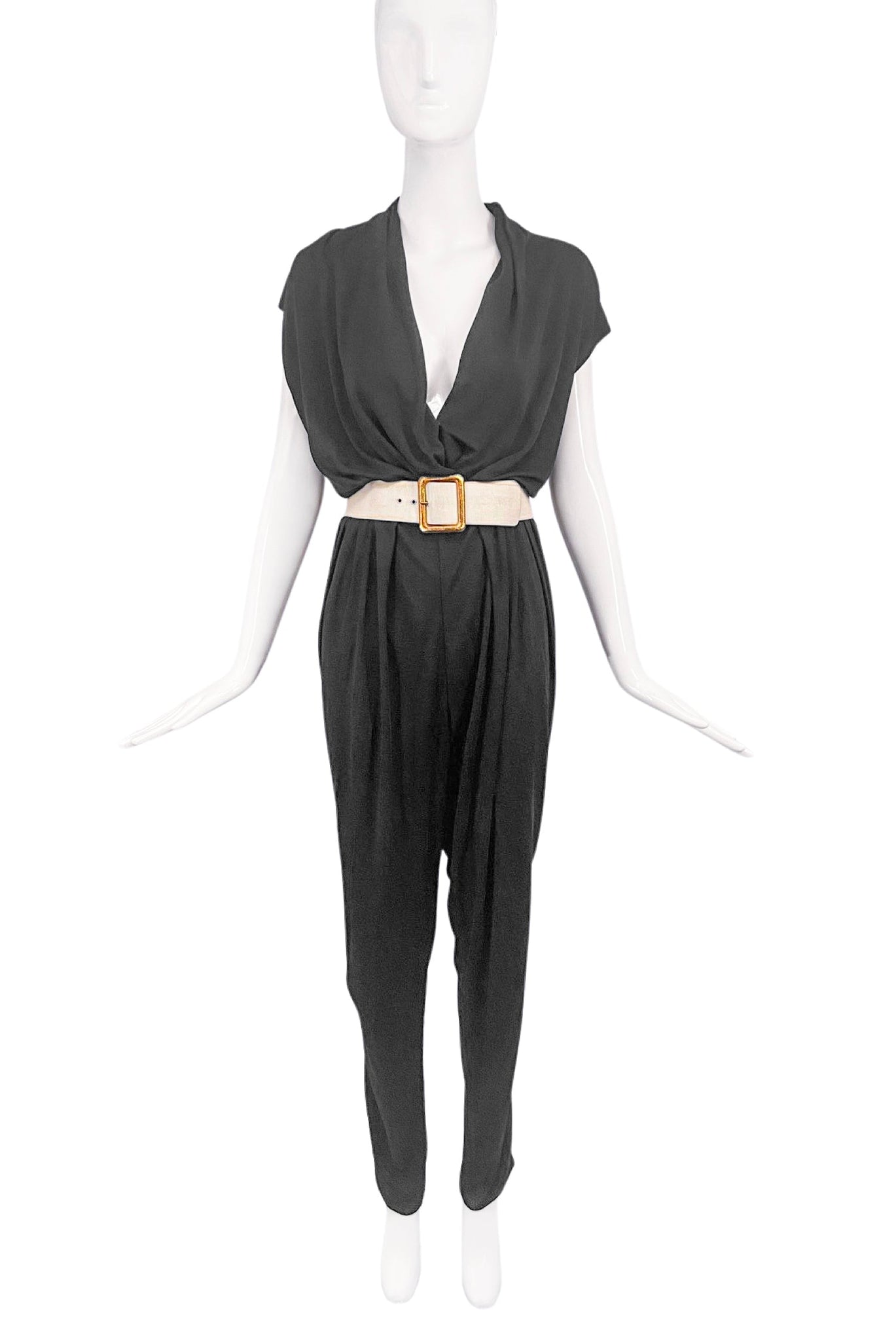 Lanvin Black Silk Jersey Draped Jumpsuit with Gold Oracle Wide Belt