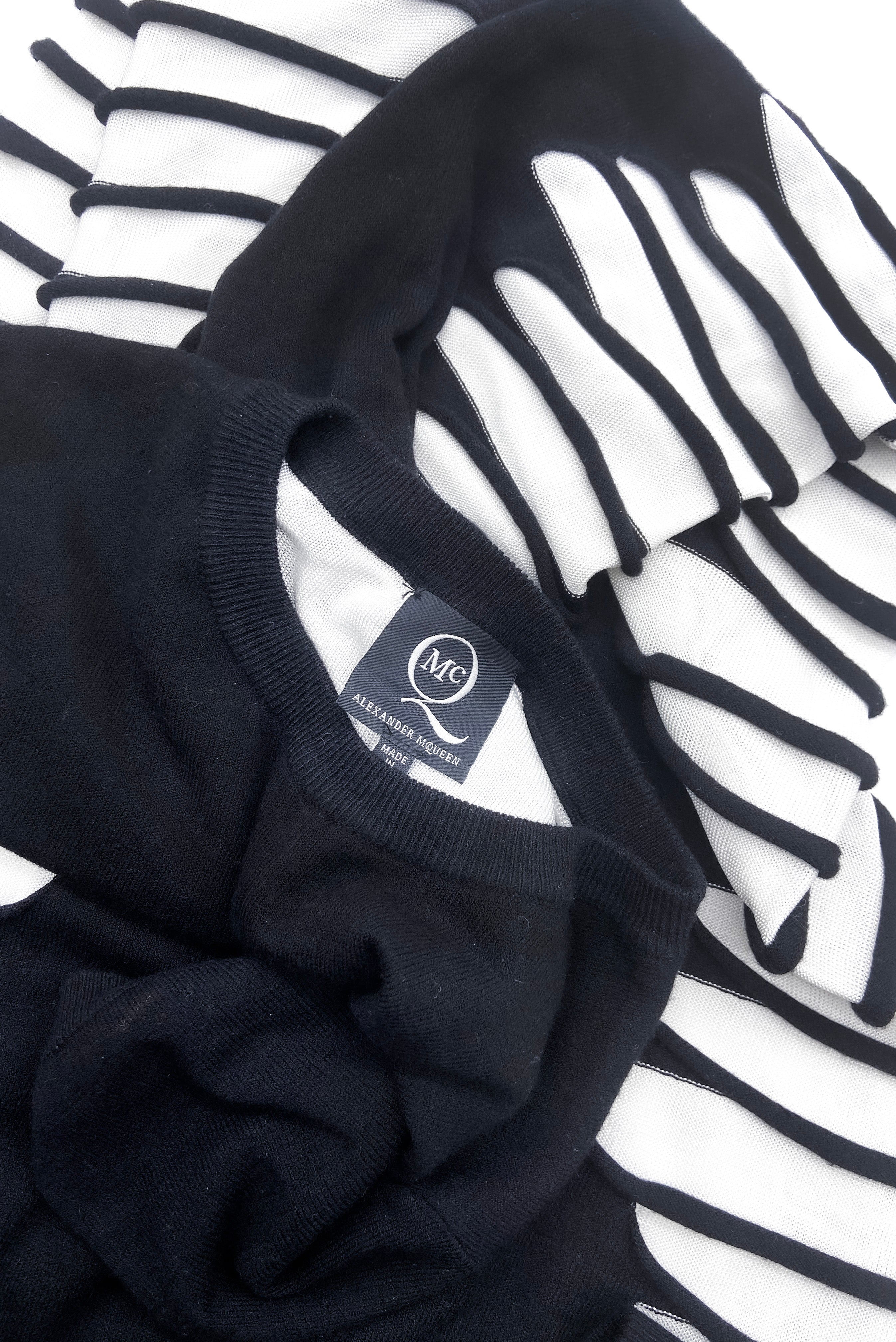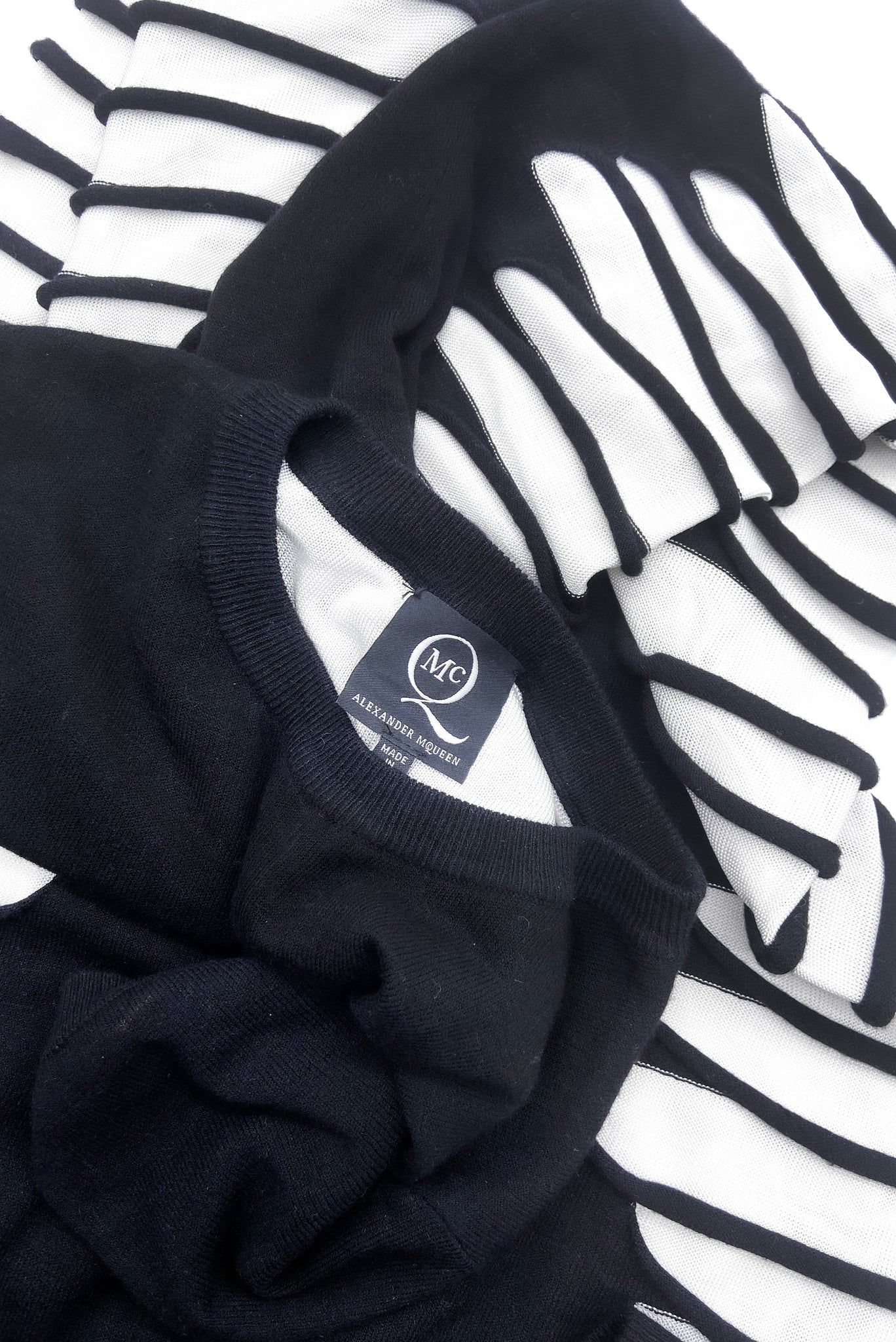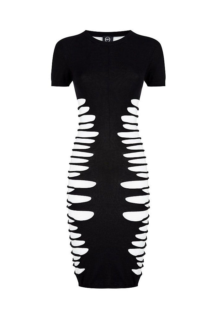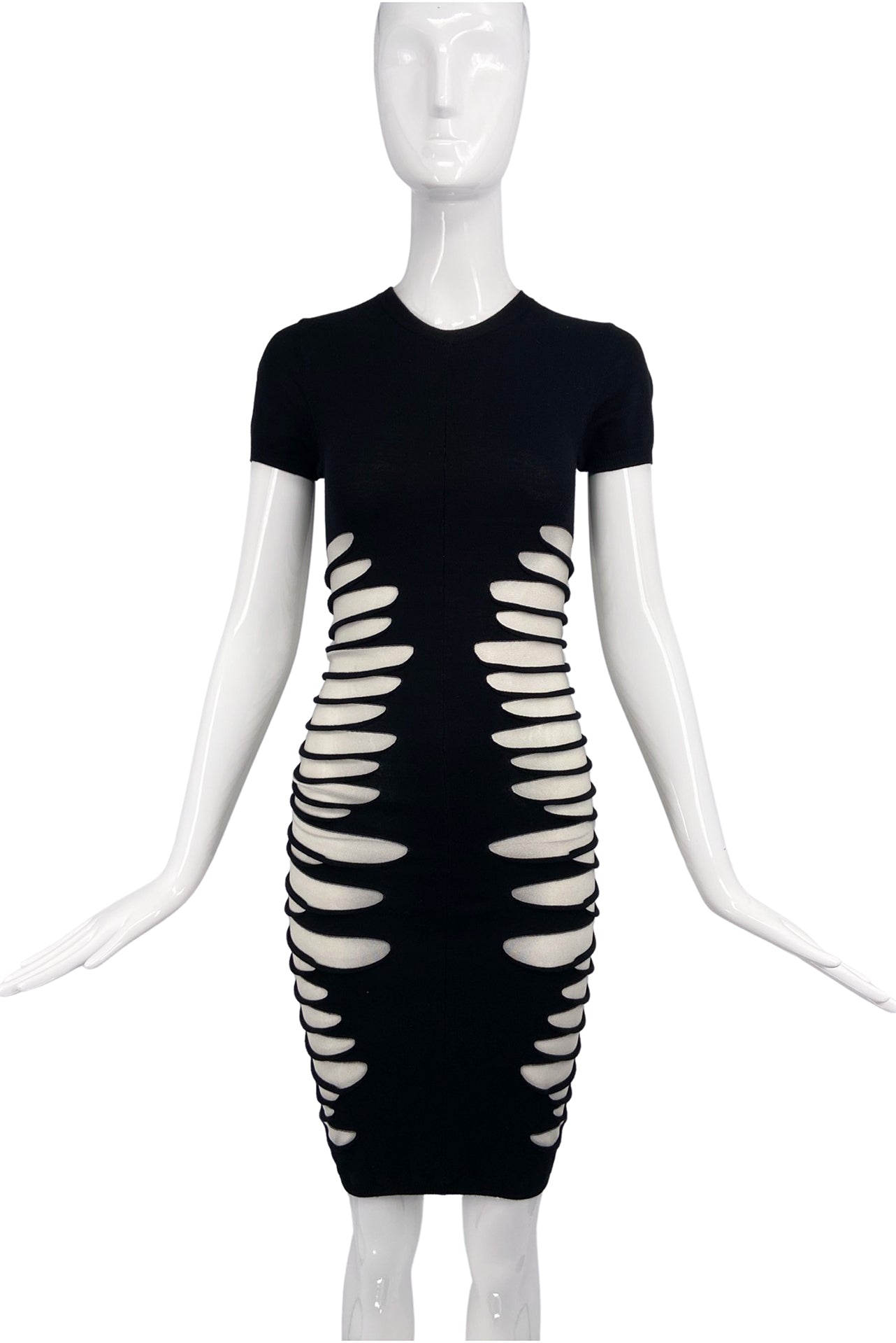 A McQ Alexander McQueen black body con style knit dress with short sleeves and a crew neckline. The dress has a shredded style detailing at the sides with a white panel underneath. The fitted dress is knee length.