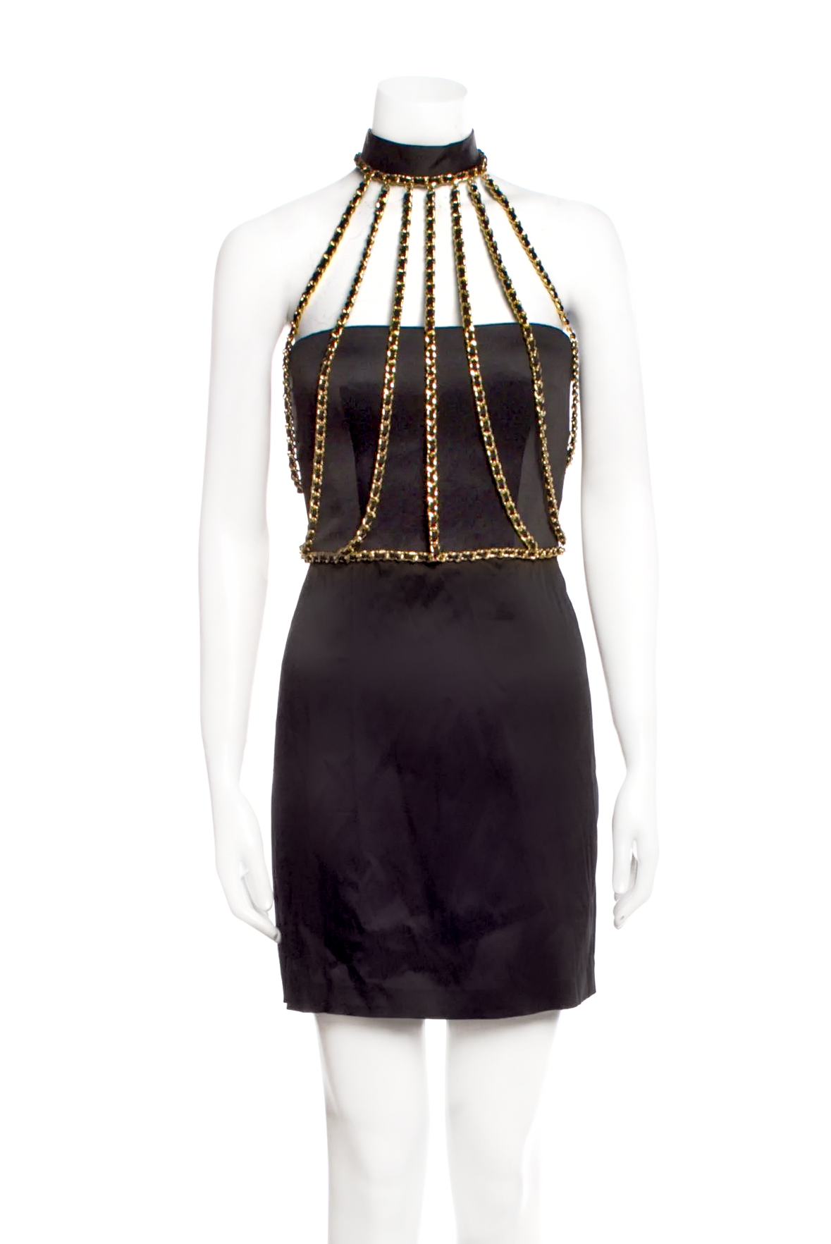Moschino Couture Black Bustier Gold Chain Harness Cage Chanel Style Dress