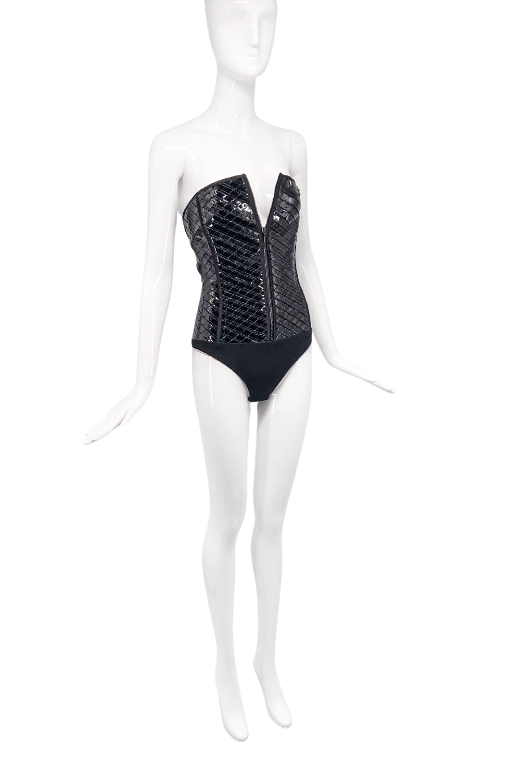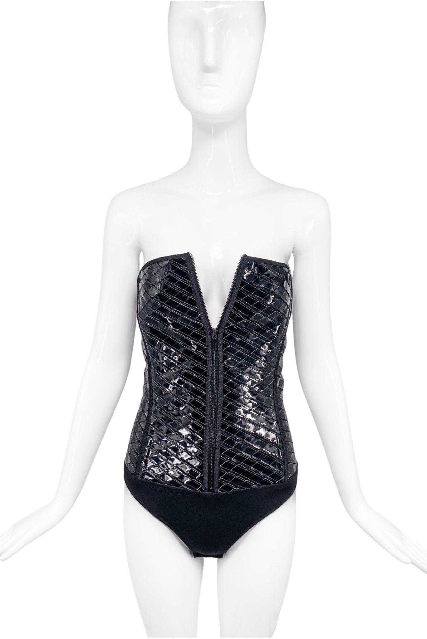 Mugler Black Patent Leather Stretch Zipper Bodysuit Corset Top Runway Spring 2018