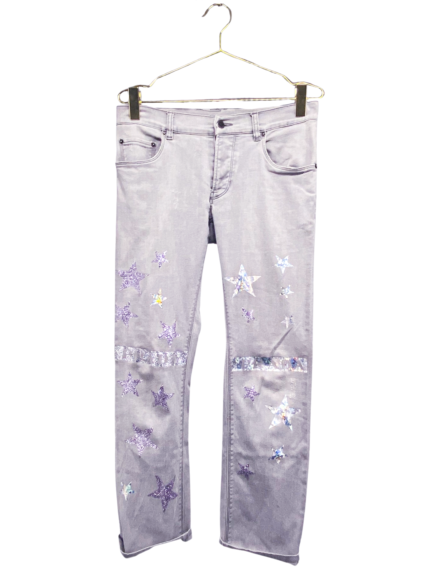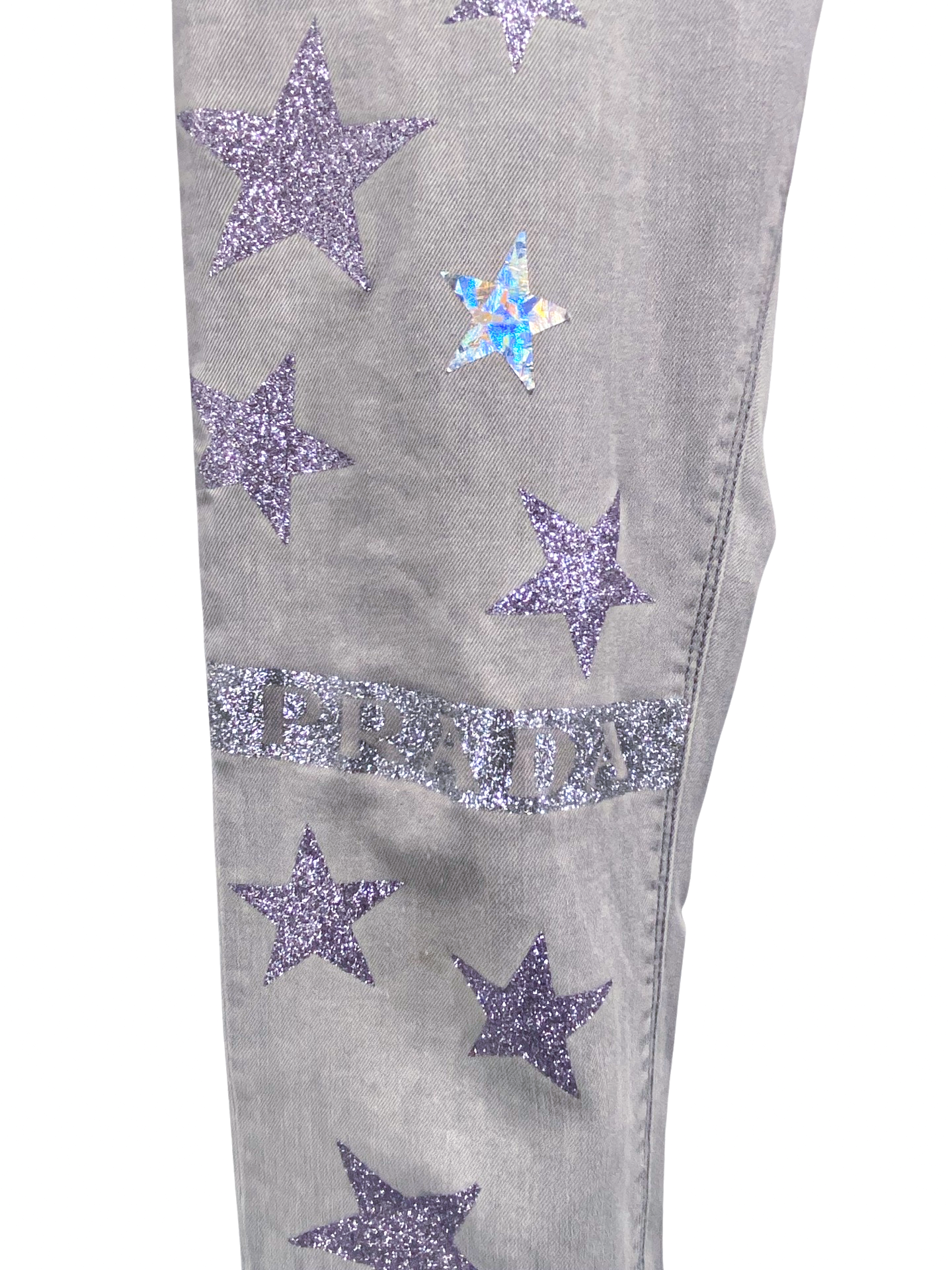 Prada Grey Denim Pants with Iridescent Sparkle Star and Logo Details