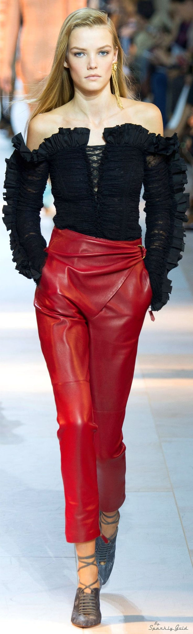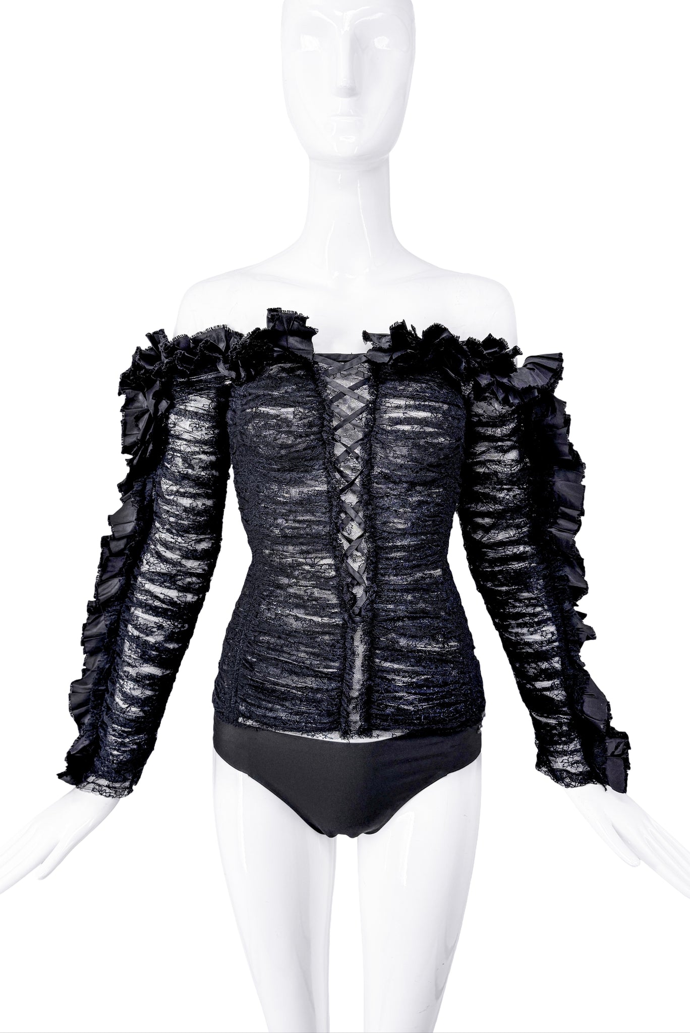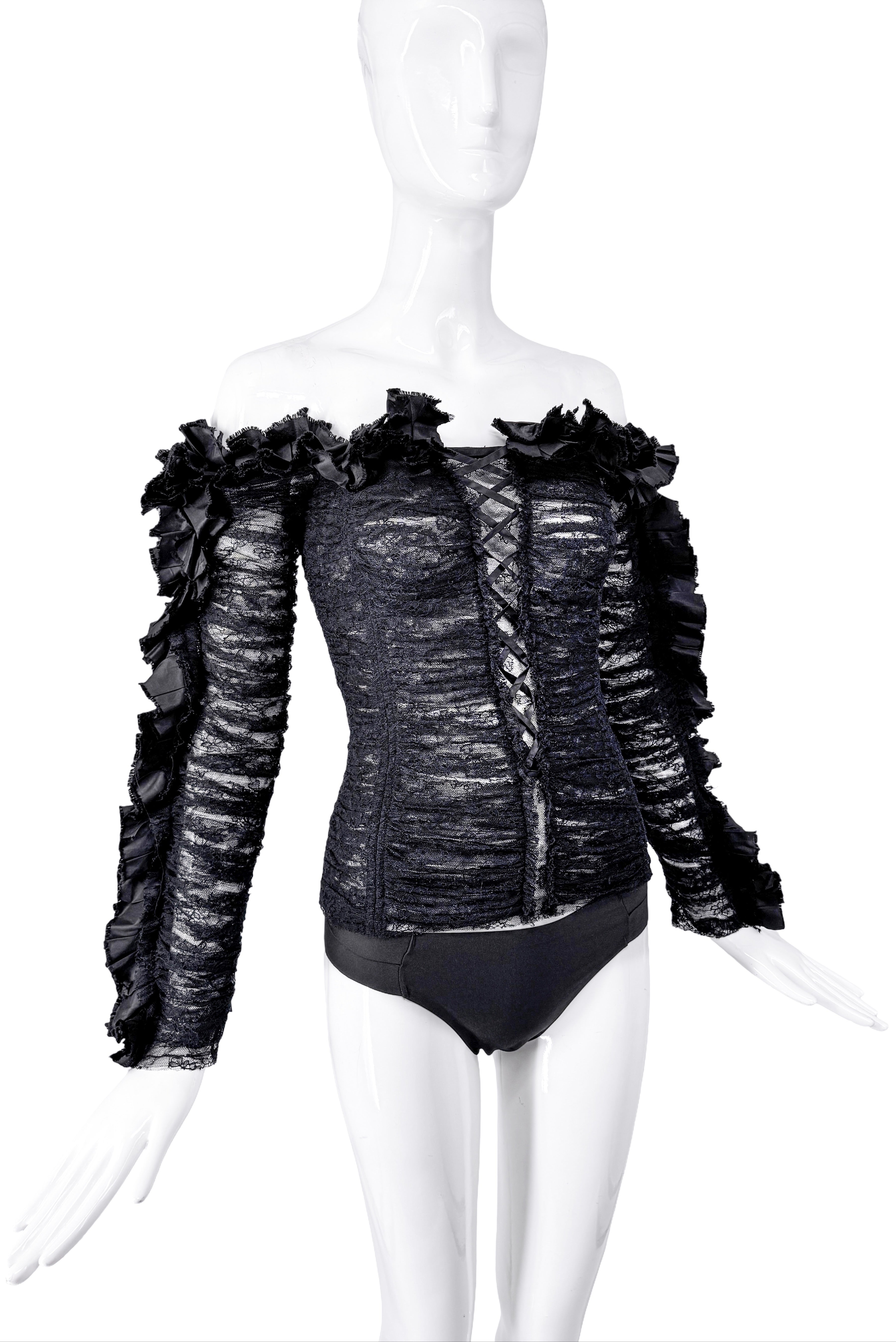 Roberto Cavalli Black Ruffle Lace Off Shoulder Corset Top Spring 2016
