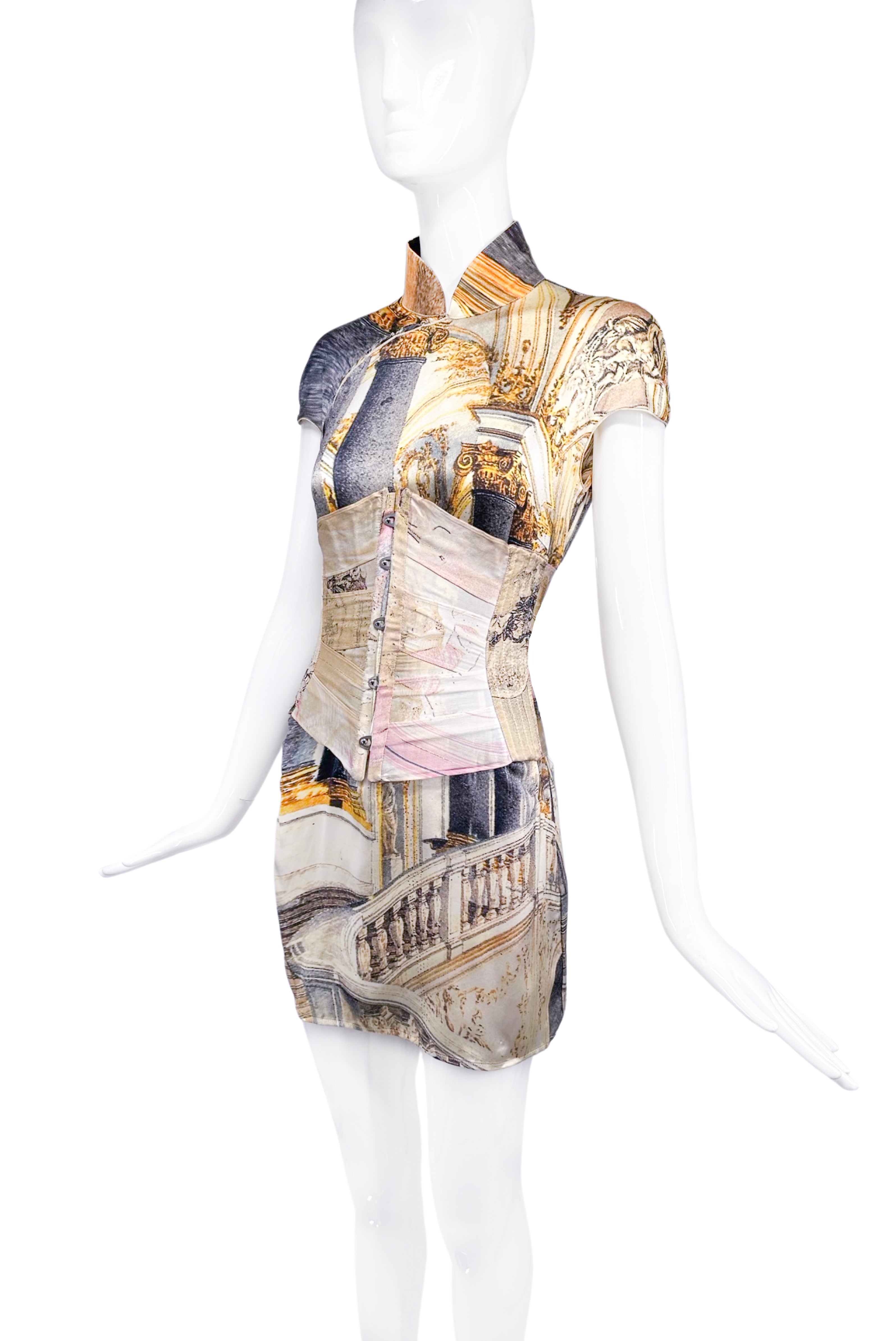 Roberto Cavalli Gold Pink Iconic Baroque Print Mini Dress with Corset Runway Spring 2003