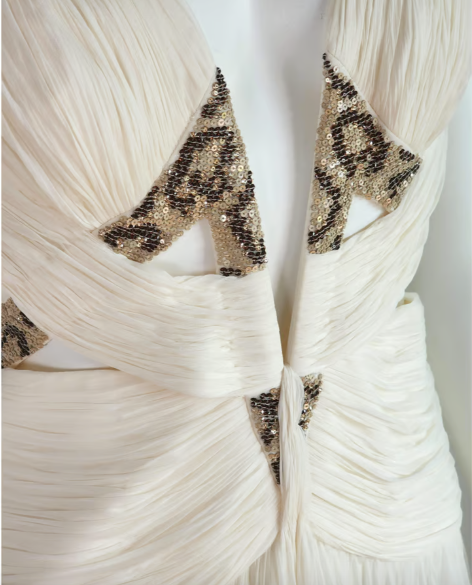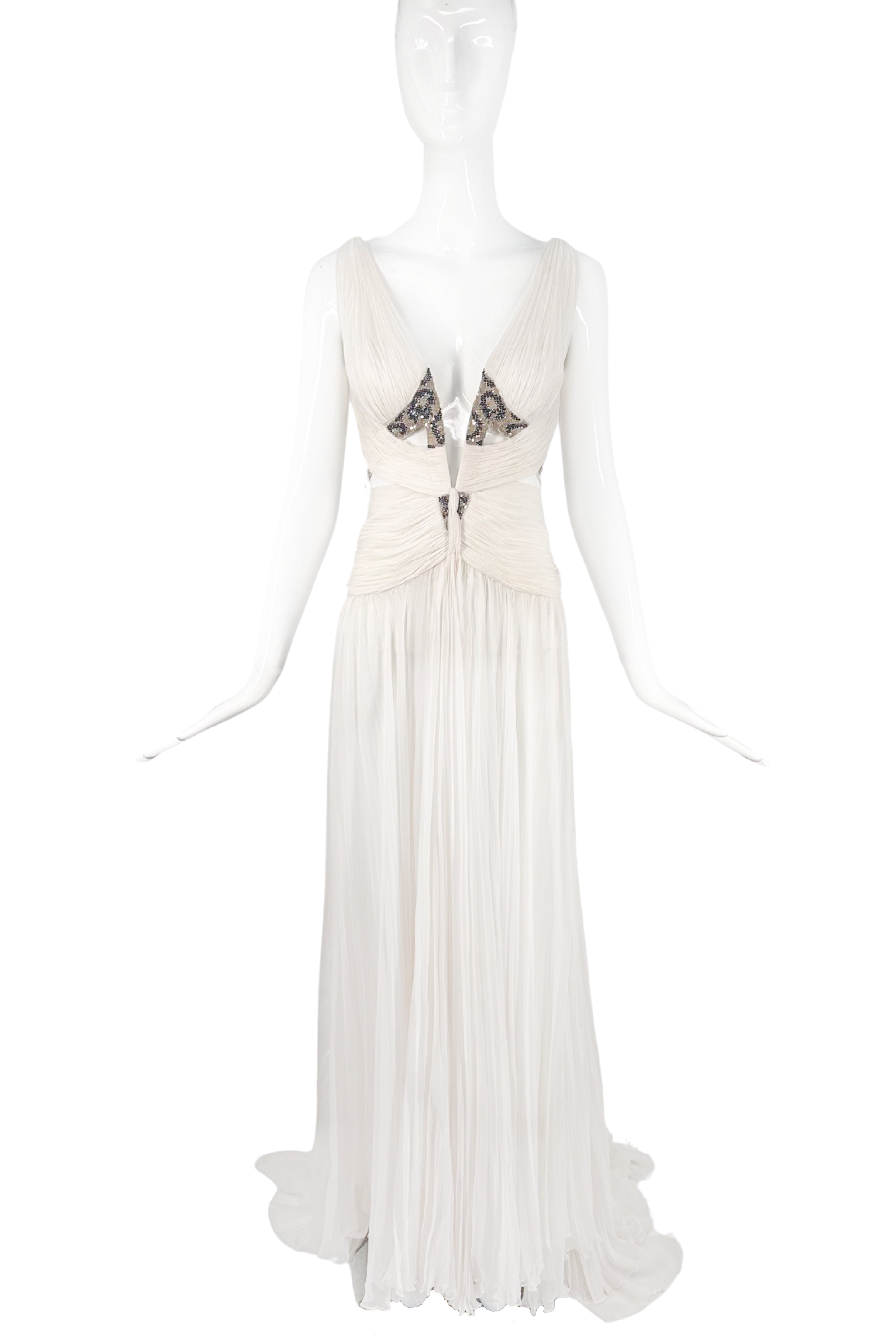 Roberto Cavalli White Cream Silk Pleated Cut Out Leopard Beaded Corset Gown