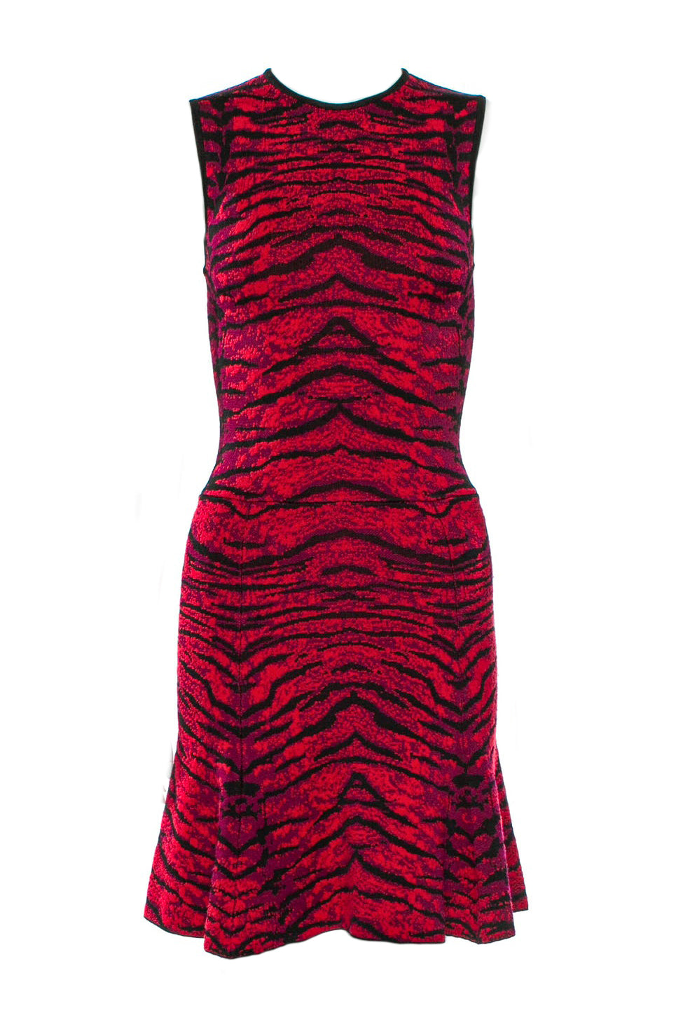 A Ronny Kobo red and black tiger stripe print dress in a sleeveless fit and flare style dress. The body conscious fitted dress has a crew neck style neckline with black piping and a slight mermaid flare at the hem of the dress.