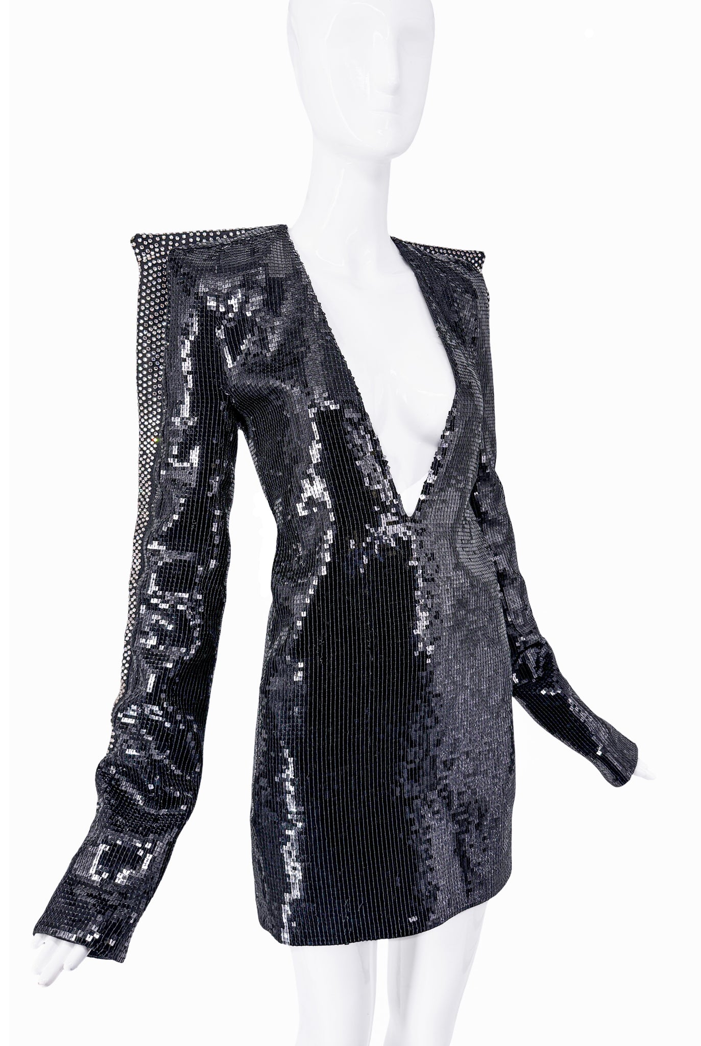 Saint Laurent Black Sequin Crystal Shoulder Deep V Cut Out Dress