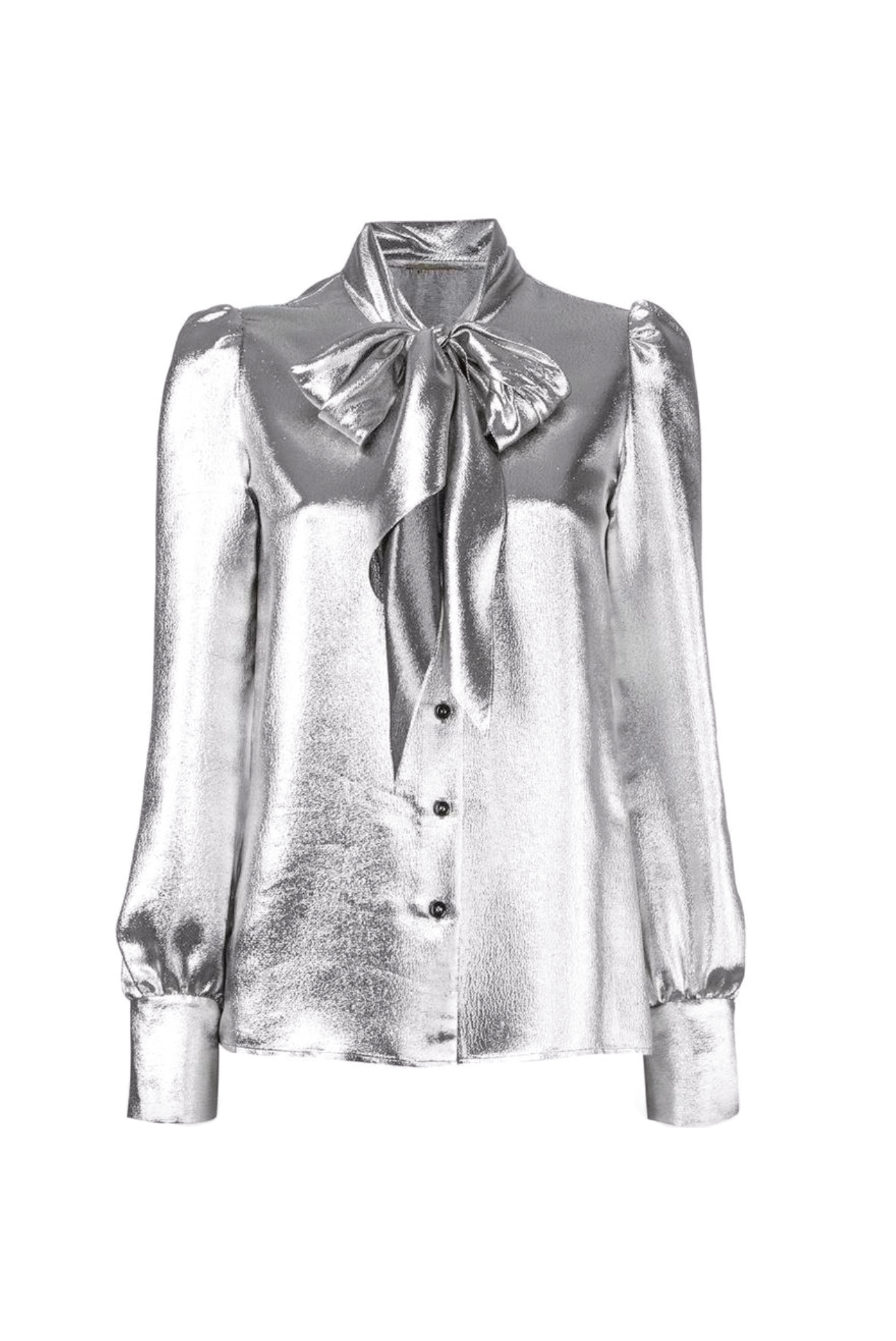 Saint Laurent Silver Metallic Lame Pussy Bow Blouse